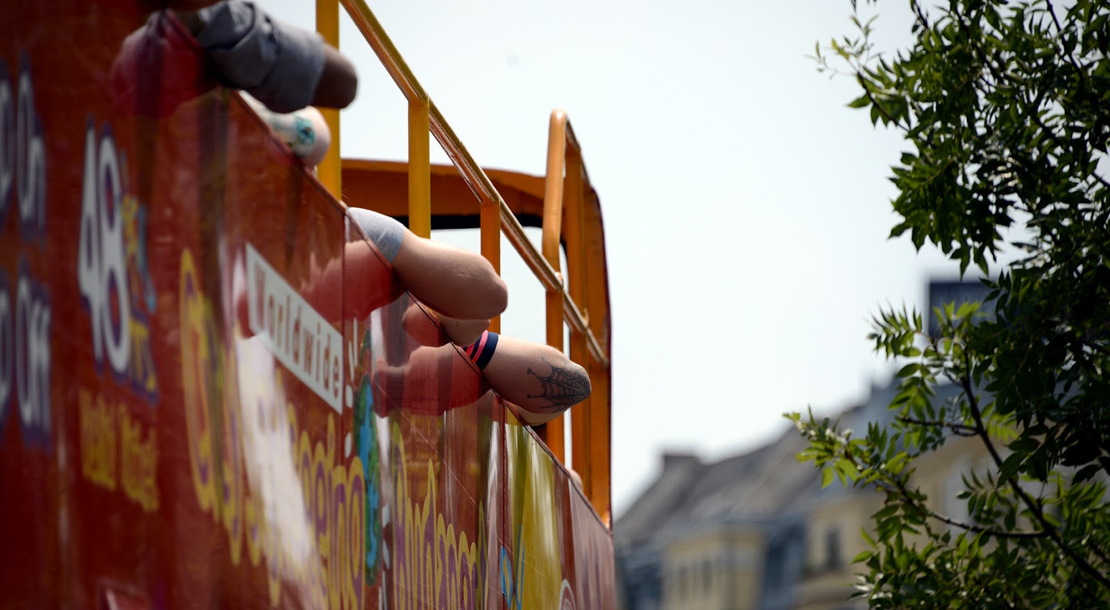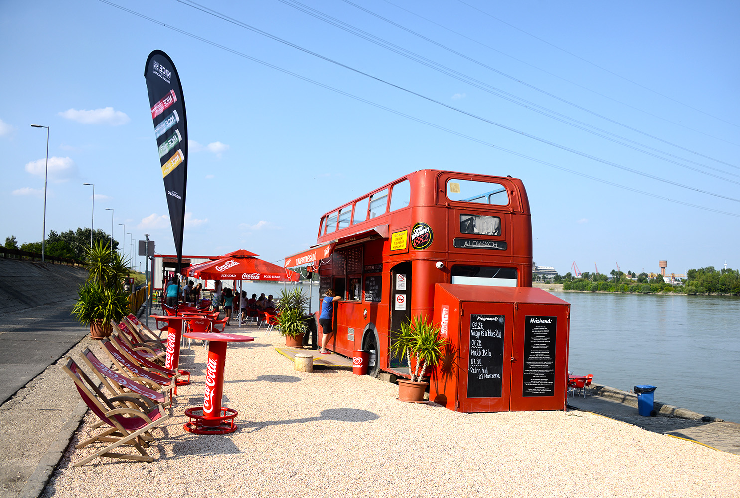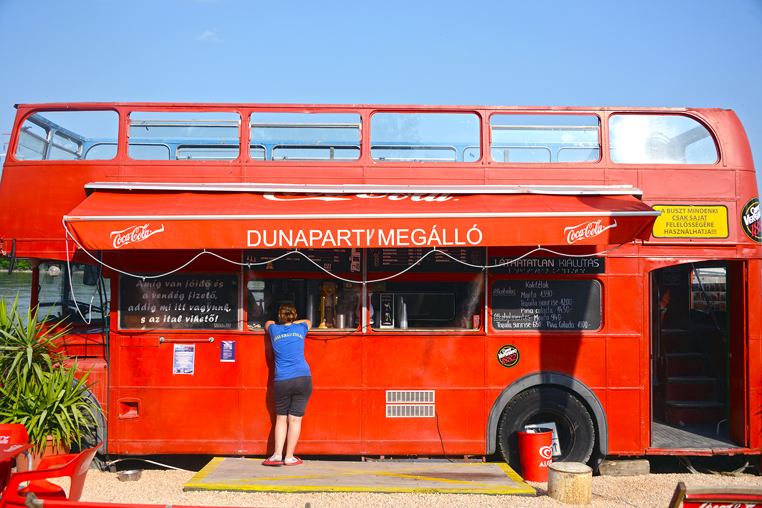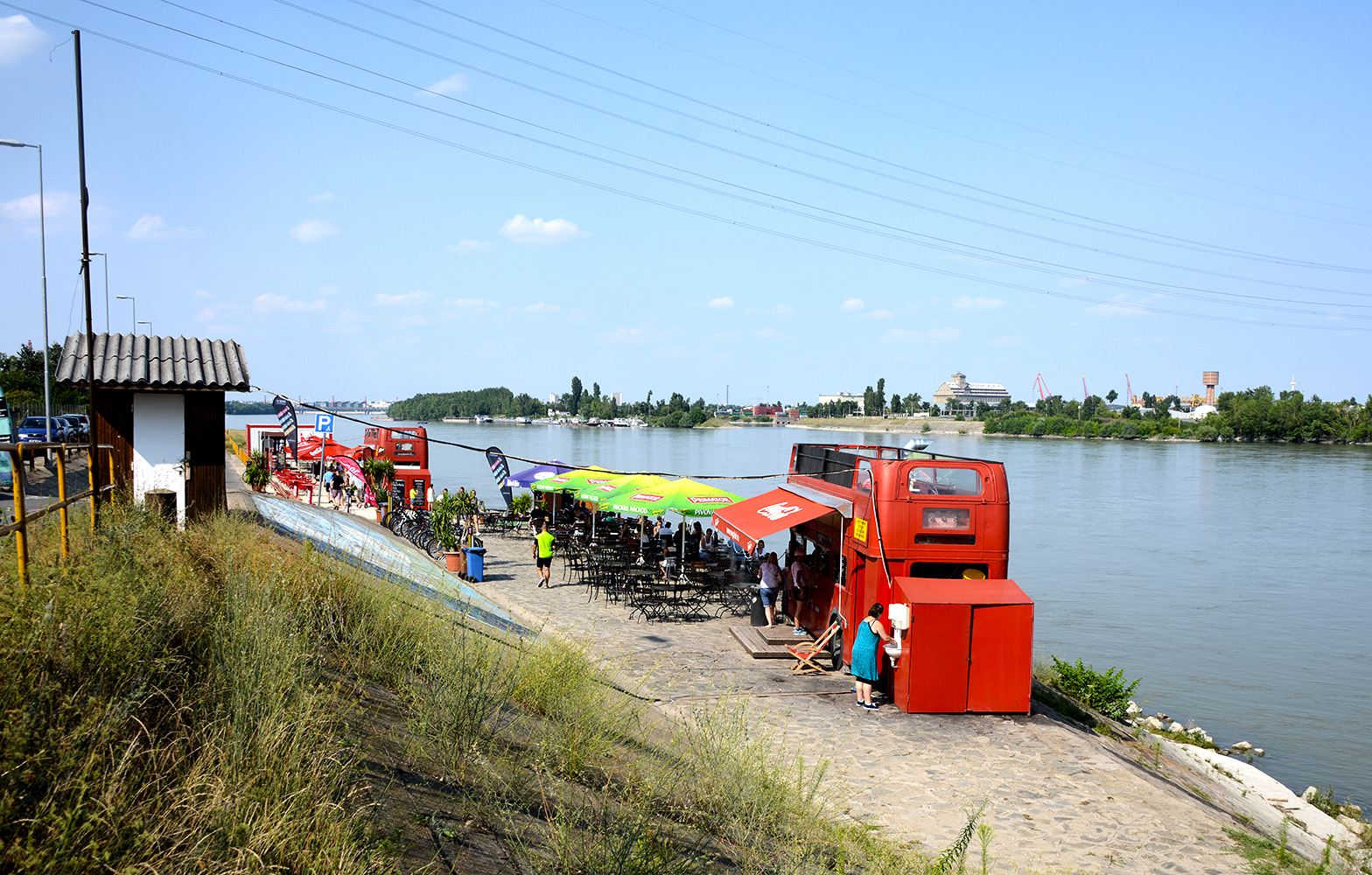 Having made it back to the crossroads where the 41 usually veers off into the great unknown, we decided it’s high time to sample some local cuisine, and we were lucky enough to aimlessly wander all the way to Promontor restaurant and its charming summer garden, which we can warmly recommend to anyone finding themselves in the centre of Budafok for any reason. Since aimlessness had worked wonders so far (this might be one of the main tenets of my life), we went on in the same manner, passing the Budafok train station and veering out to the bike track on the Danube shore. And true to form, our general unpreparedness bore fruit, and we stumbled upon a pleasant riverside establishment by the name of Dunaparty megálló, which consists of two disaffected double-deckers (looking for logic is beyond the point here), one dispensing food, the other one dispensing beverages, amongst them real, wonderful, Czech beer.