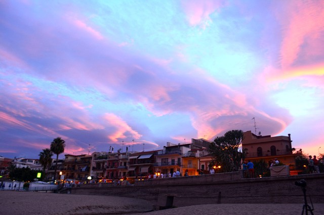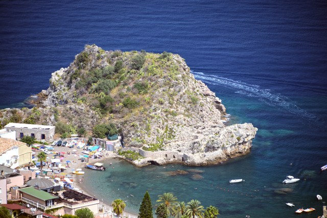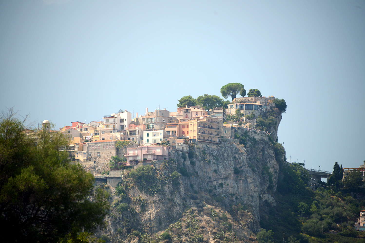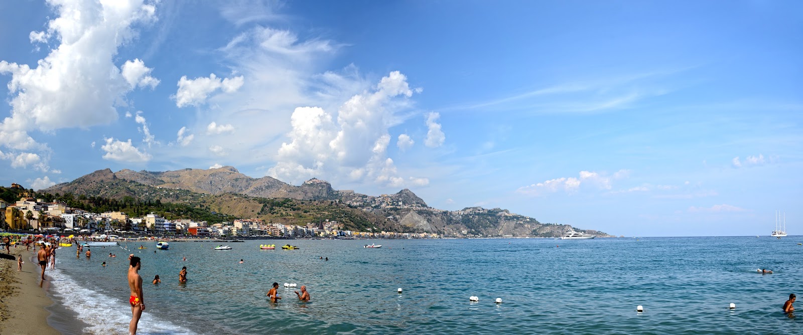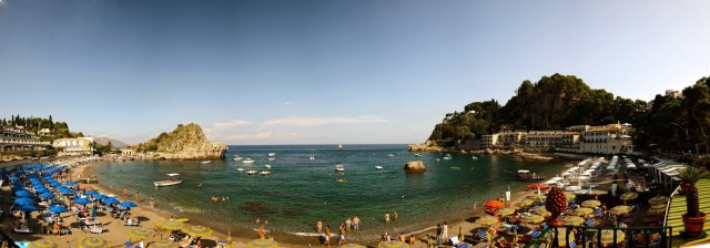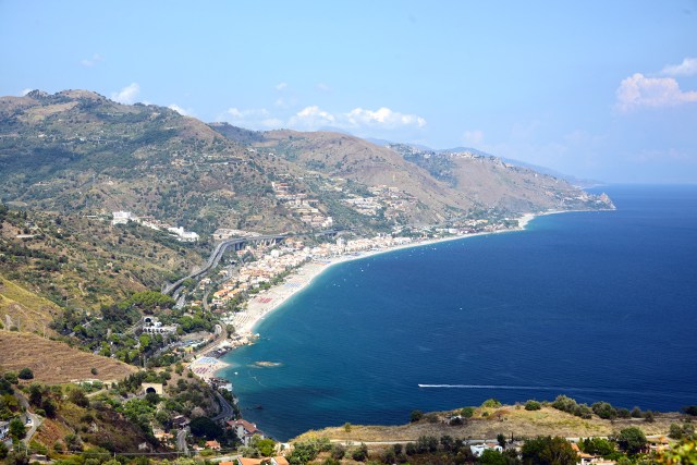 This long odyssey of mysterious names might require some explanation: the jewel of the Ionian coast, Taormina, to the further bewilderment of tourists, Italian and foreign alike, is actually not by the sea, but perched on the rocks above the shore. It therefore has no beaches itself- this role is fulfilled by the beaches of Letojanni, approachable by bus, and Mazzaró, which is connected to Taormina by cable car- the trip lasts a five minute maximum. These beaches are however pretty expensive, so a safe bet is to choose the homelier sister village of Giardini Naxos instead- accommodation and food are both cheaper here, and there is a long stretch of enjoyable sandy beaches as well. Even higher up the rocks you can find Castelmola, the sole real purpose of which is to provide great views of Taormina and Etna on the horizon.