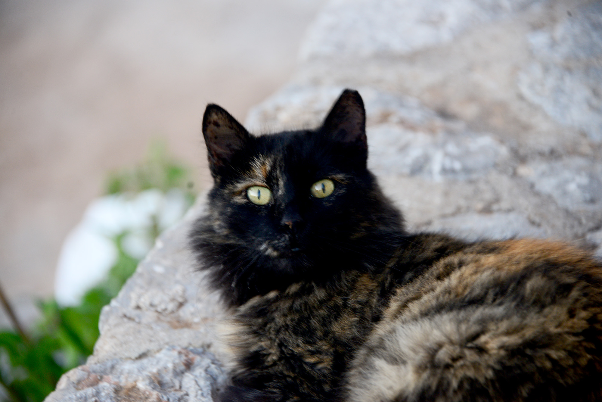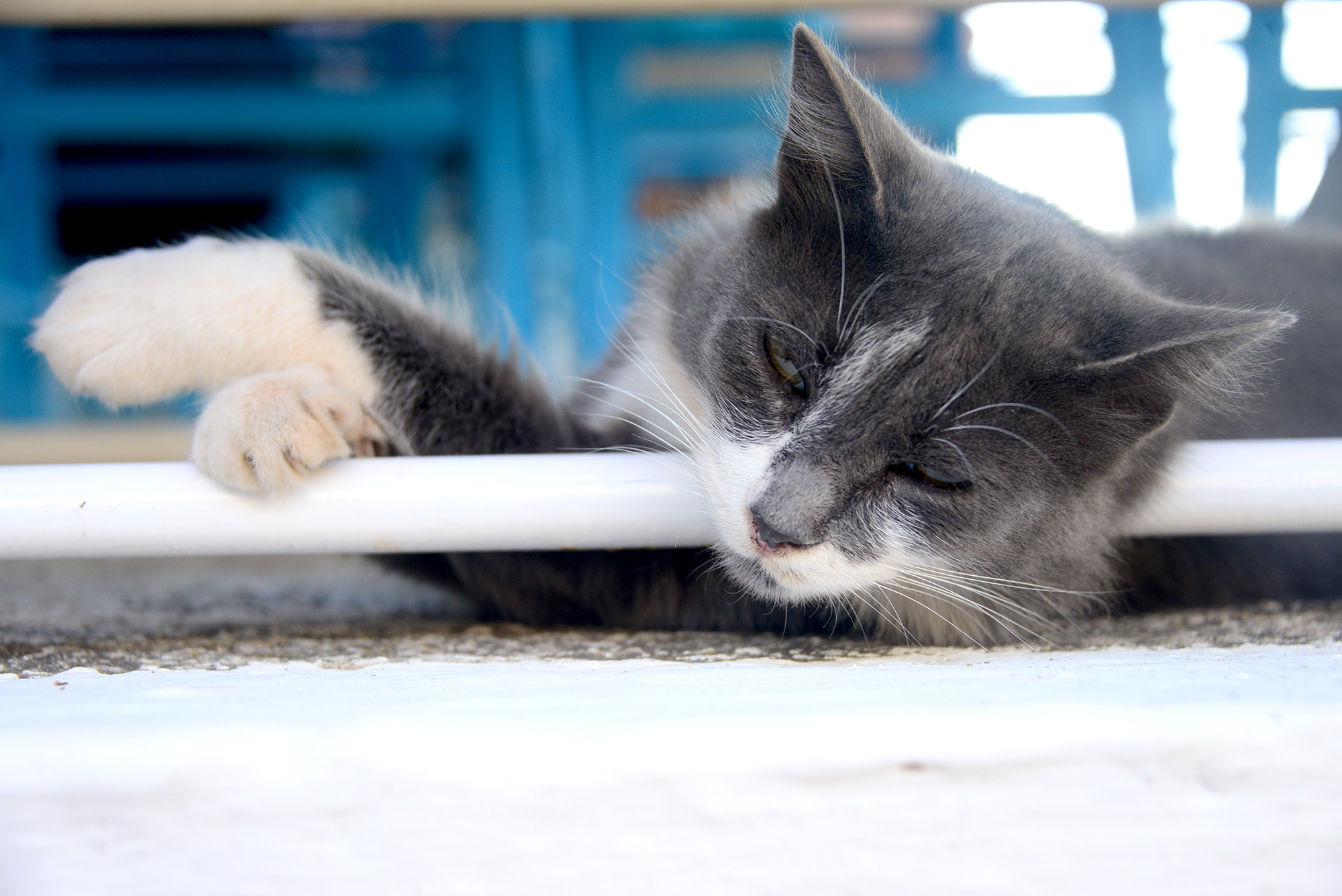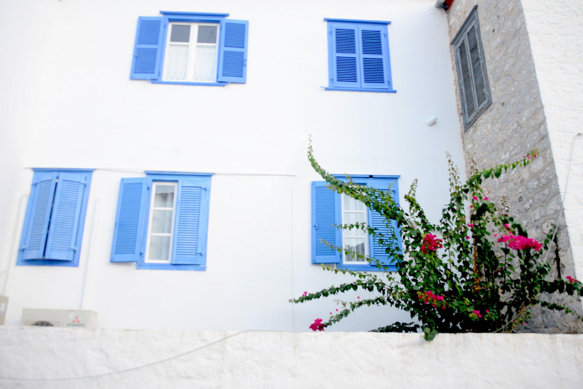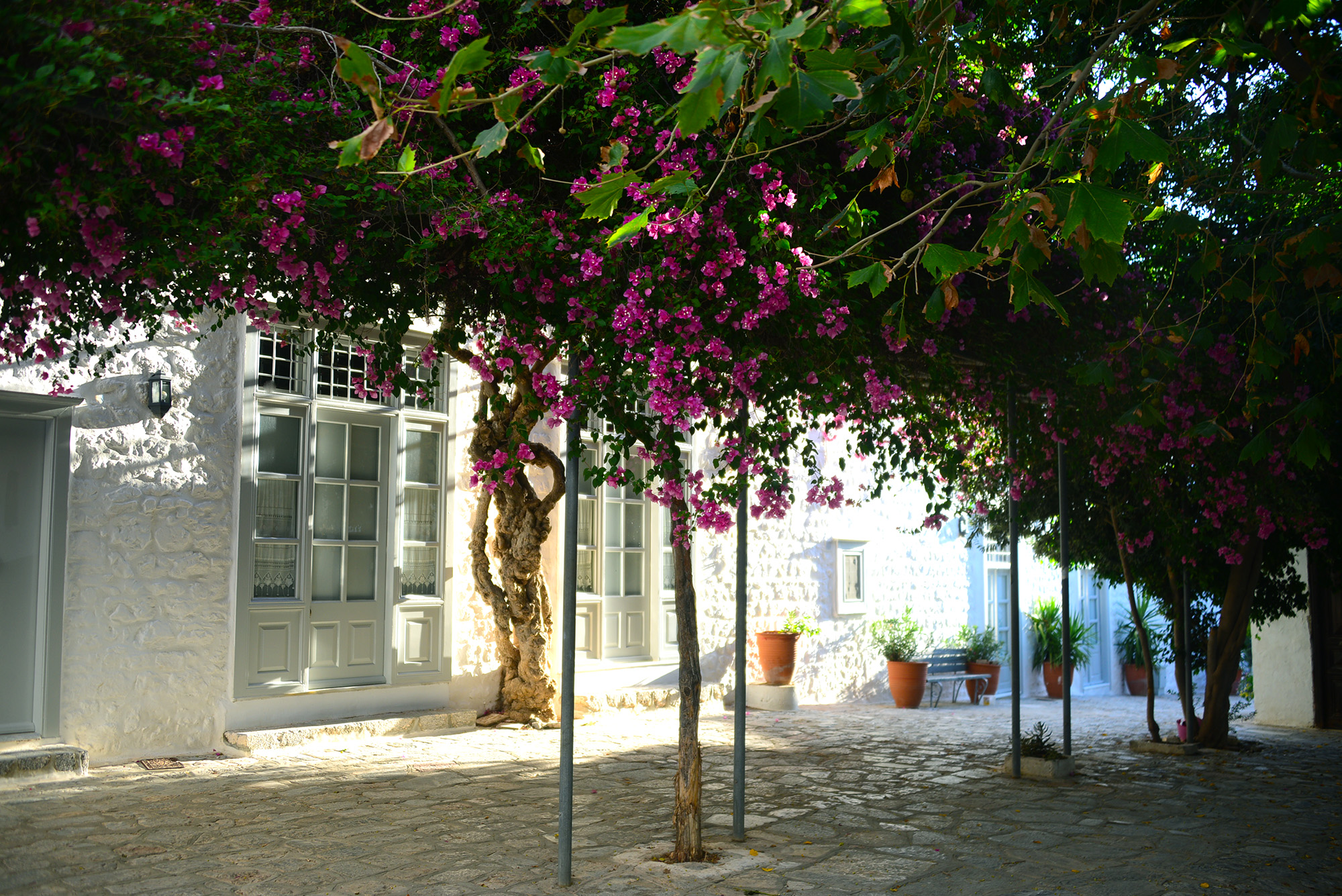 About five minutes away, Avlaki beach is Spilia without the fuss and the bar, a narrow trail veering down through a thicket of pines to a sheltered pebbly beach. In truth, with one exception, all of Hydra’s beaches are stony, excessively beautiful but unkind to your feet. Insert uncharacteristic practical advice: do follow the example of the blog’s industrious co-photographer and buy surf shoes. The road snakes on and brings unexpected encounters. An old, twisted tree cradles the pirate overlord of the island: a giant, mean mannered white cat with paws wounded in battle and pink ears delicate like film burned mercilessly by the sun. His demeanour shows no regret and no repentance, he has chosen a life of rebellion over the pampered destiny of a port cat fed into submission with fish and greasy leftovers. His eyes open just so, narrow slits of a condescending stare. He is hurt, but proud and, in his way, he is free.