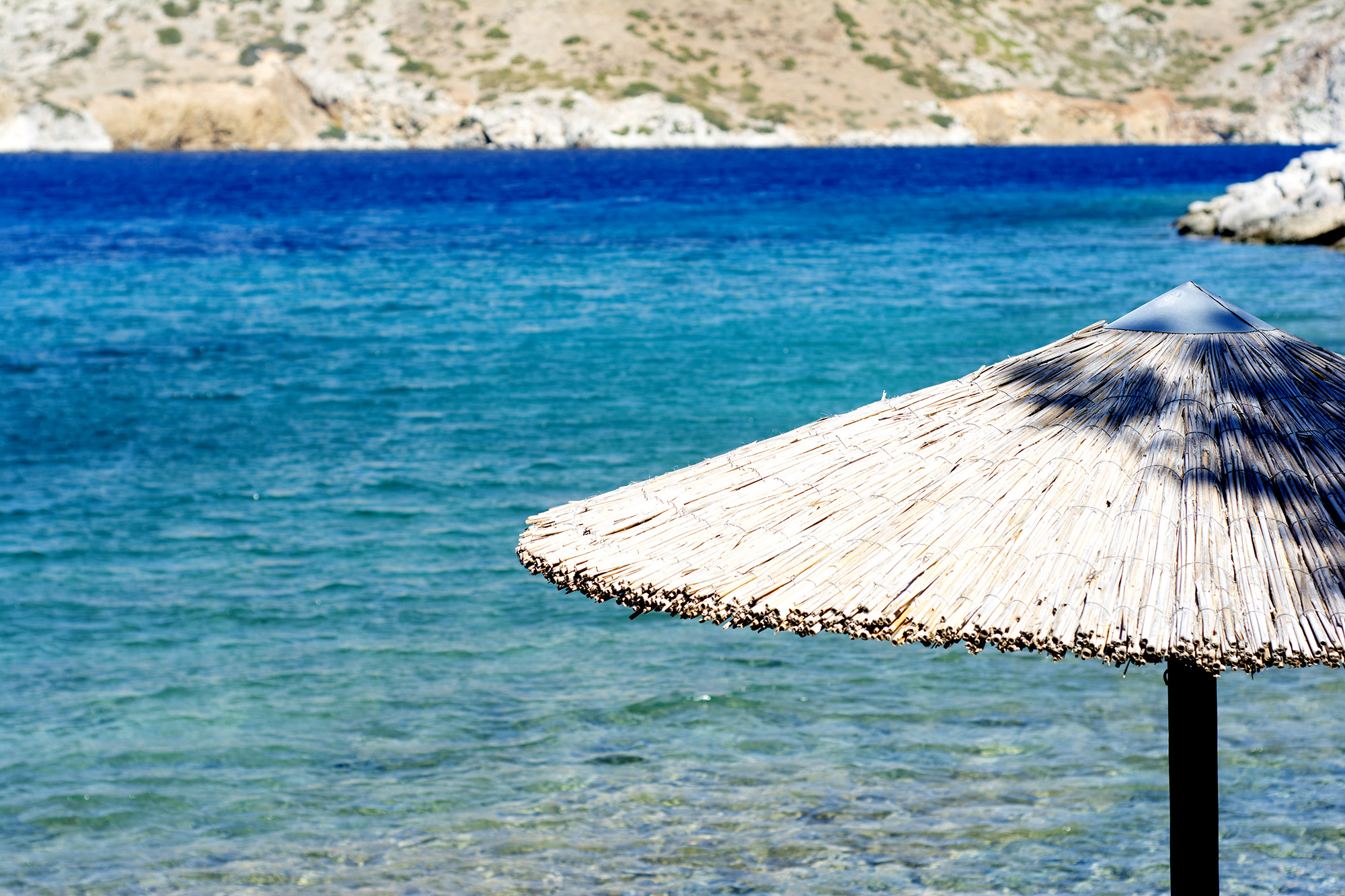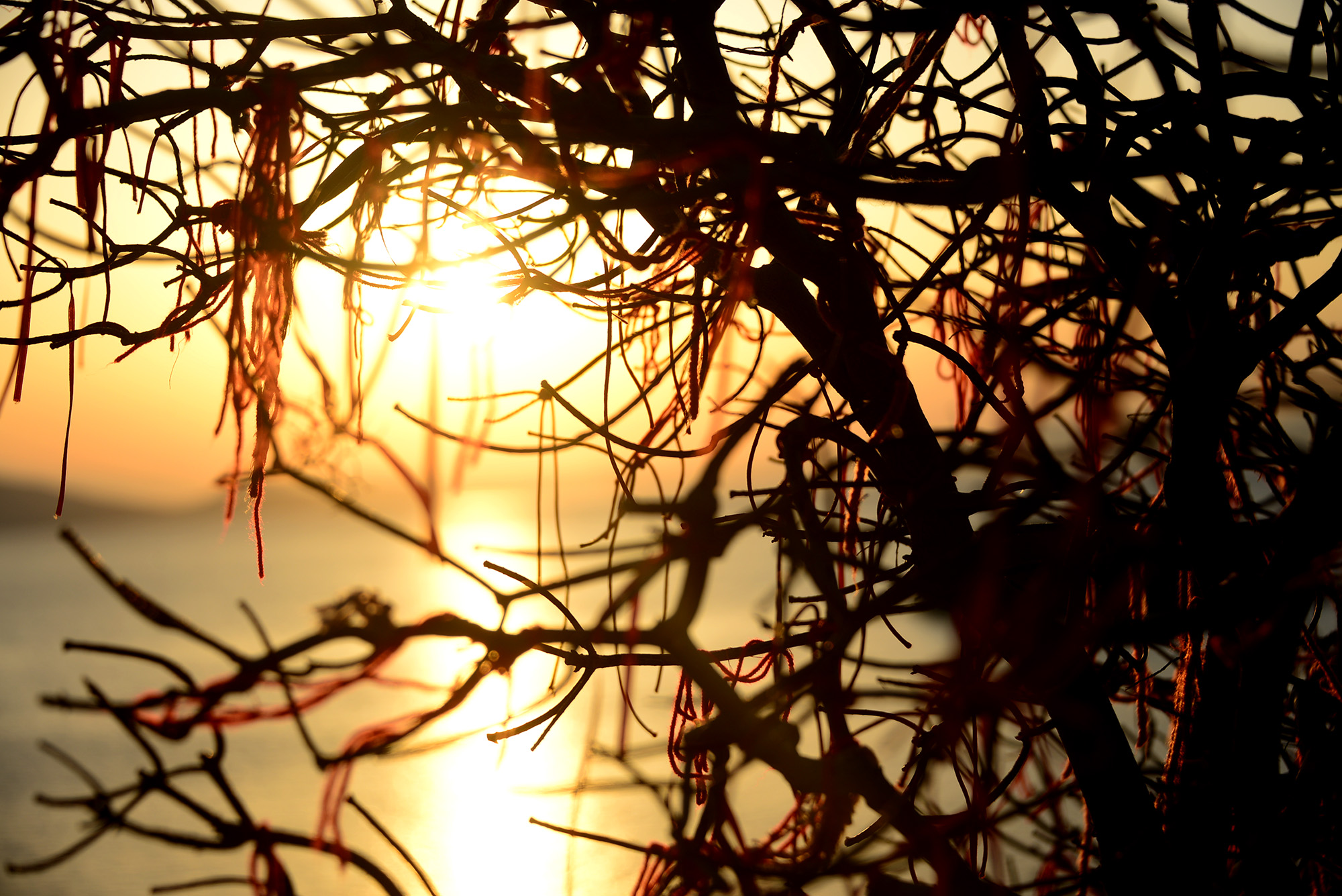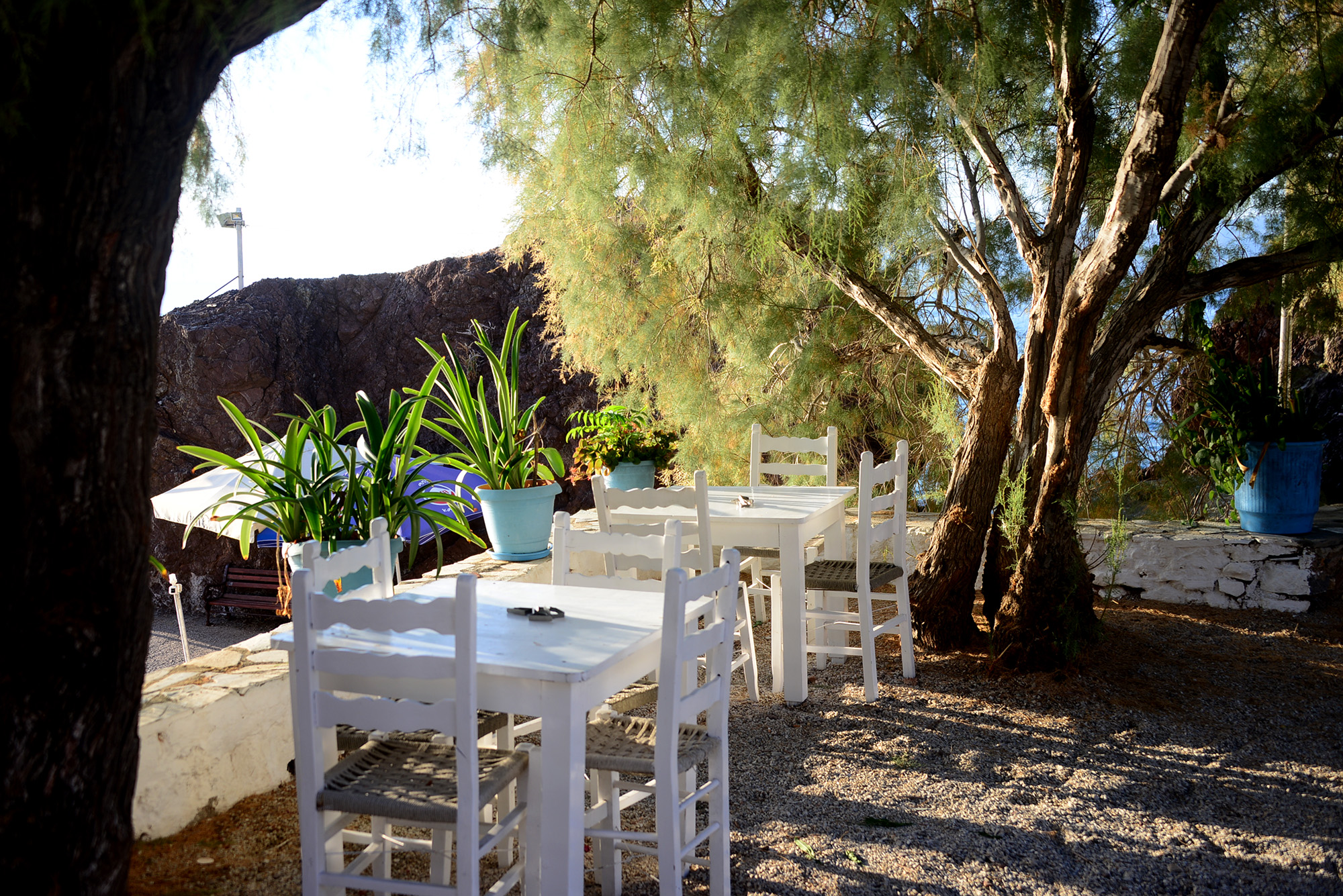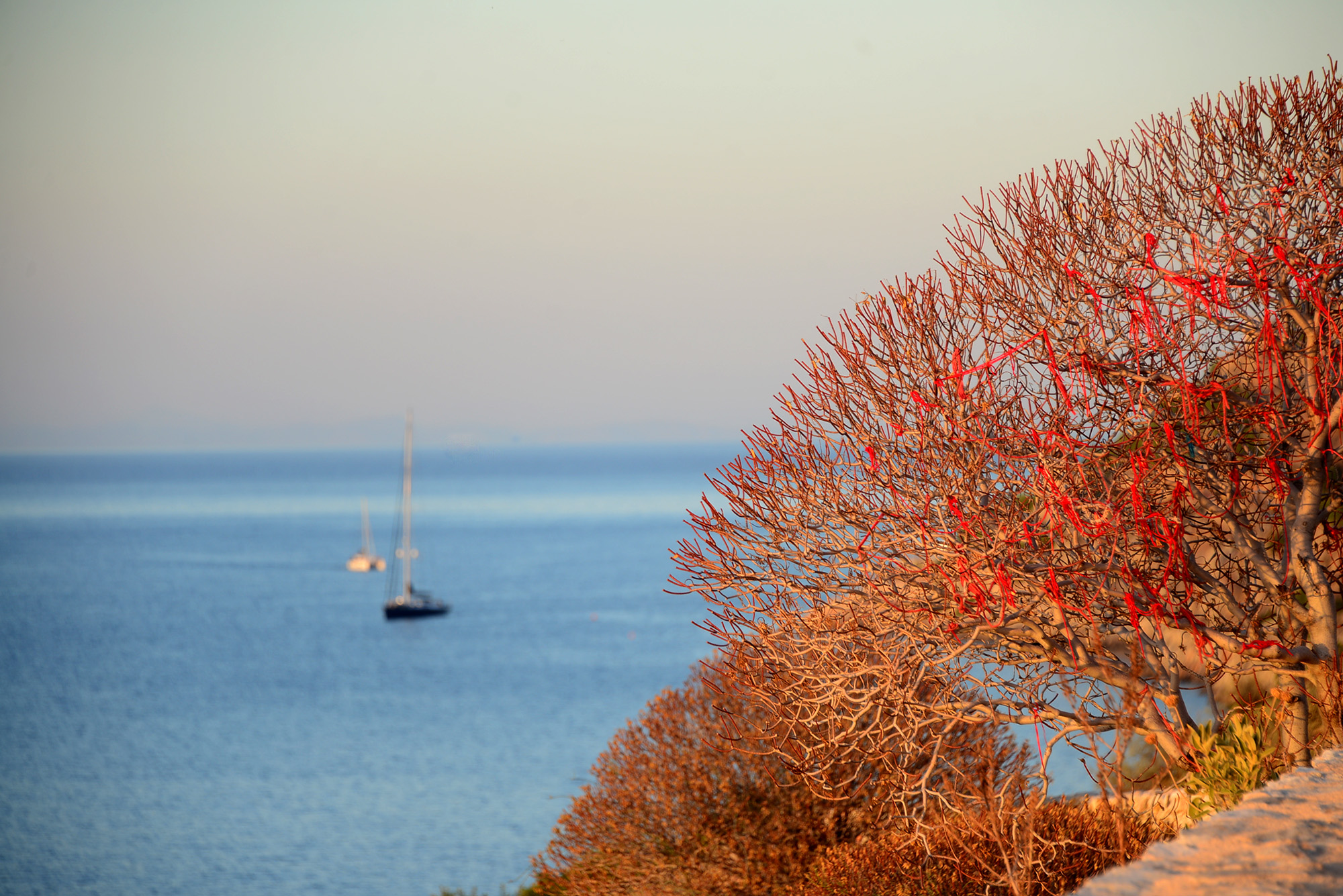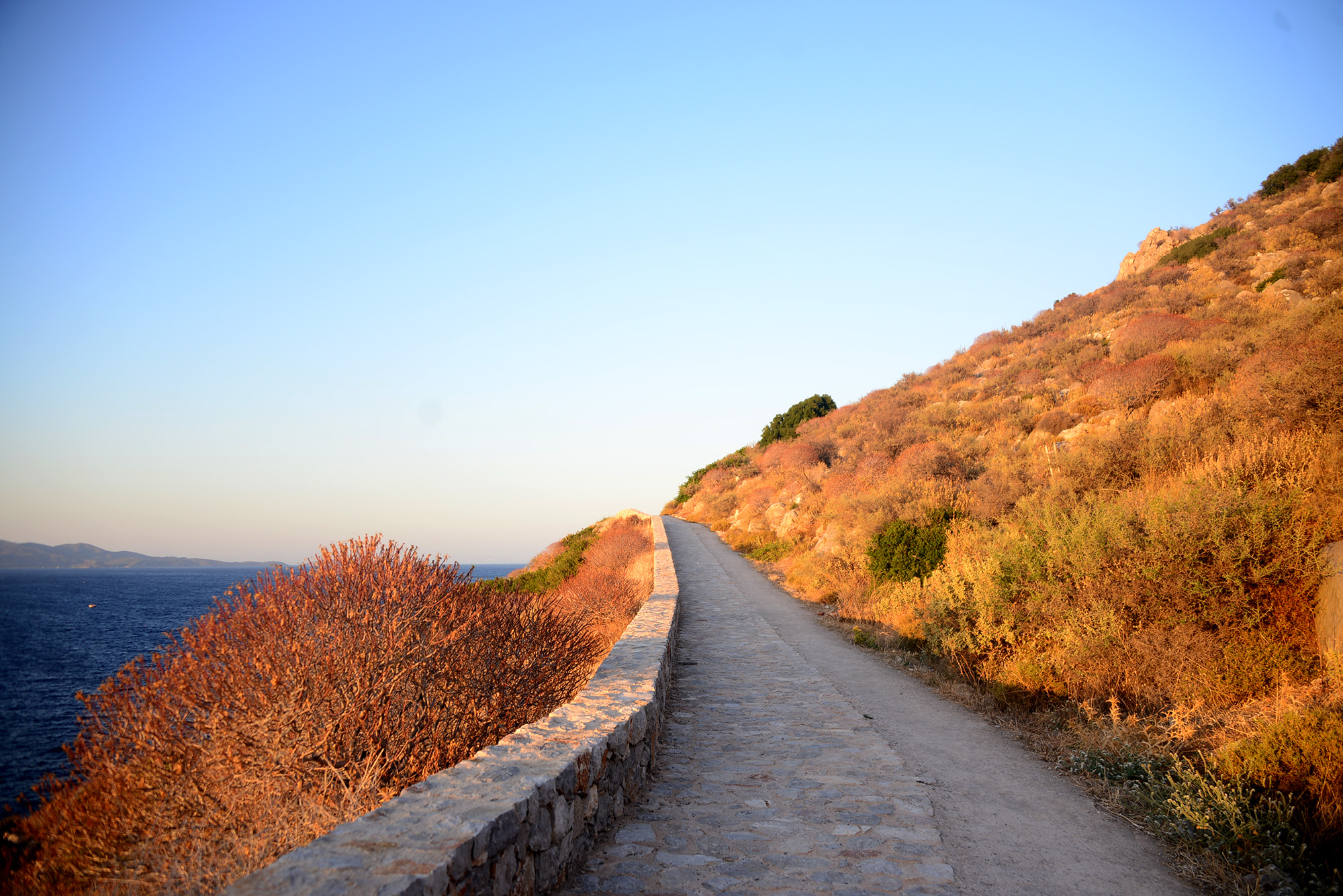 Kamini beach itself is somewhat vampirized by the Castelo bar, which offers the kind of expensive sunbeds that look nice but are hideously uncomfortable so it’s best to keep going, even if the length of the next stretch and the absence of shade can seem forbidding during the day. Come evening, though, it’s time for a very Greek metamorphosis. The sun dipping behind the mainland paints the sky purple and peach, the sea a blanket of trembling blue, skinny boats slipping by like ghosts. The small trees and thorny bushes by the road catch the last rays of the day, looking, from a distance, biblically aflame, dark crimson and cochineal. Cochineal, incidentally, is a colour I met in a Jo Nesbø novel, and unsurprisingly has its root in the Greek kokkinos.