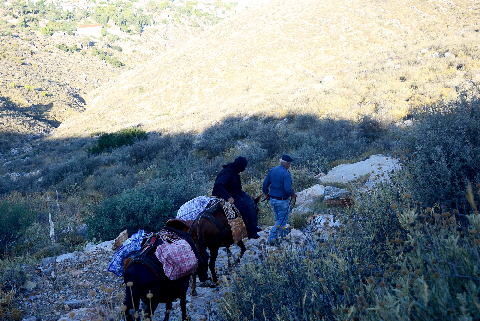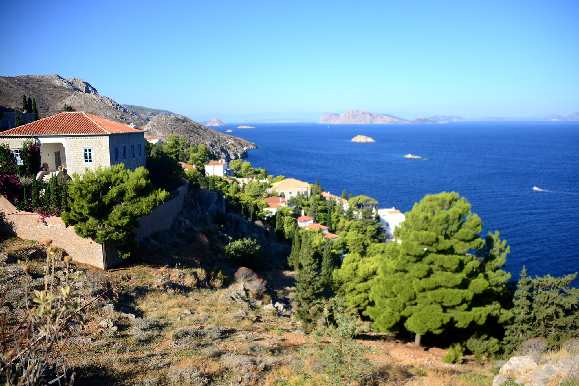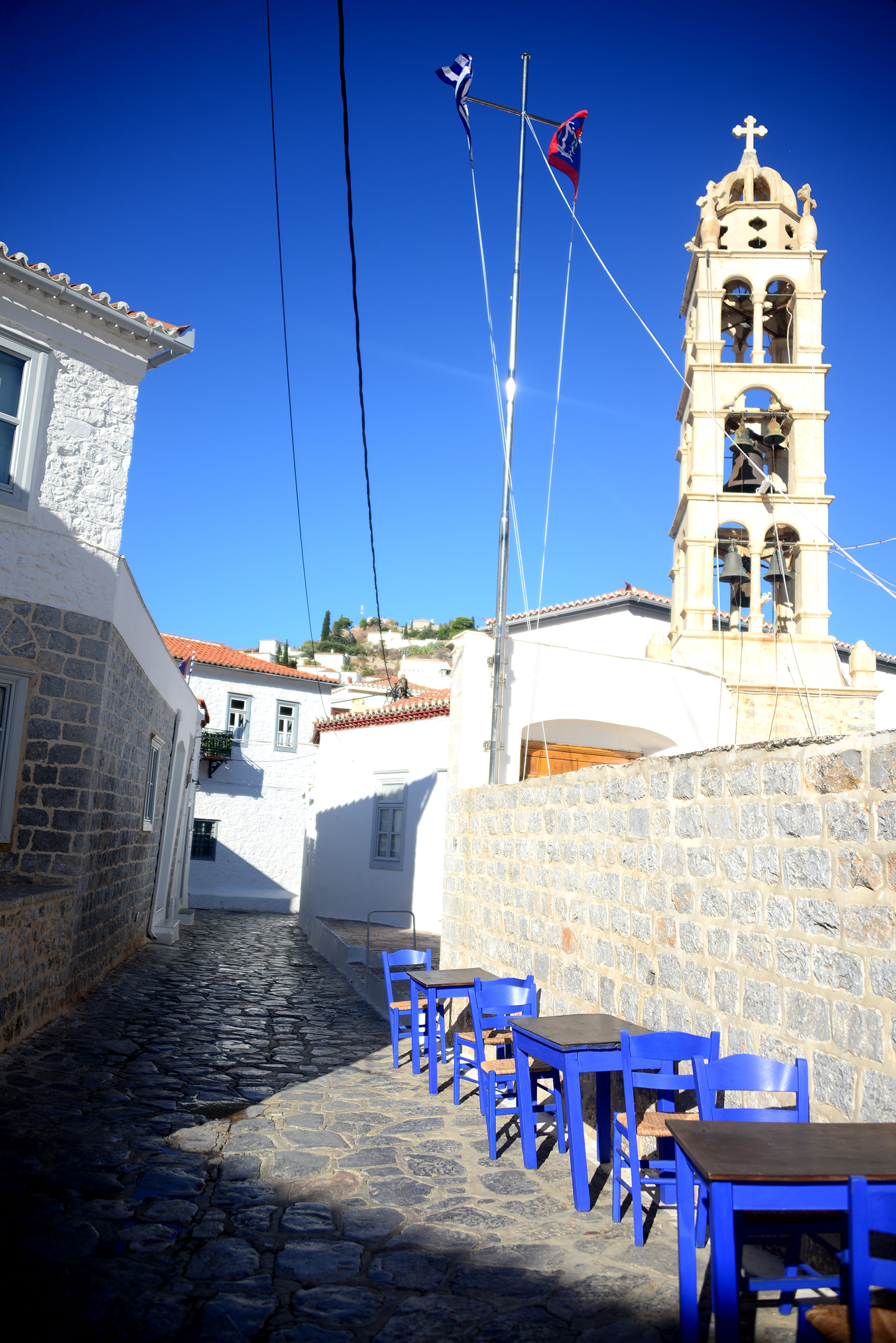 In the small port of Kamini men fiddling with their komboloi dwell in permanent rest and conversation, migrating from one row of benches to another according to the movements of the sun and shade. Everywhere you look you see churches, perched on rocks, on small islands between Hydra and the mainland, along the sunburnt road. There are around two thousand people on the island and according to certain estimates, up to six hundred altars, churches and monasteries with immaculately whitewashed walls, woodwork painted in deep blue, the flag atop them an embrace of the white and the blue, the ornate Byzantine crosses catching the rays of the sun and the moon. There is another flag too, that of Hydra itself: an anchor, a cross, another flag within the flag (flagception, pardon the pun) and the Spartan motto of ‘I tan i epi tas’, roughly translated as ‘Come back with your shield, or on it’, the kind words mothers would utter to their children before battle, preferring them dead than defeated. Definitely not faint hearted, them Spartans. If you wonder why the island would use a Spartan motto, we could launch into a very convoluted historical backstory or simply mention it’s pretty close and ancient Hydra was therefore closely connected to it.