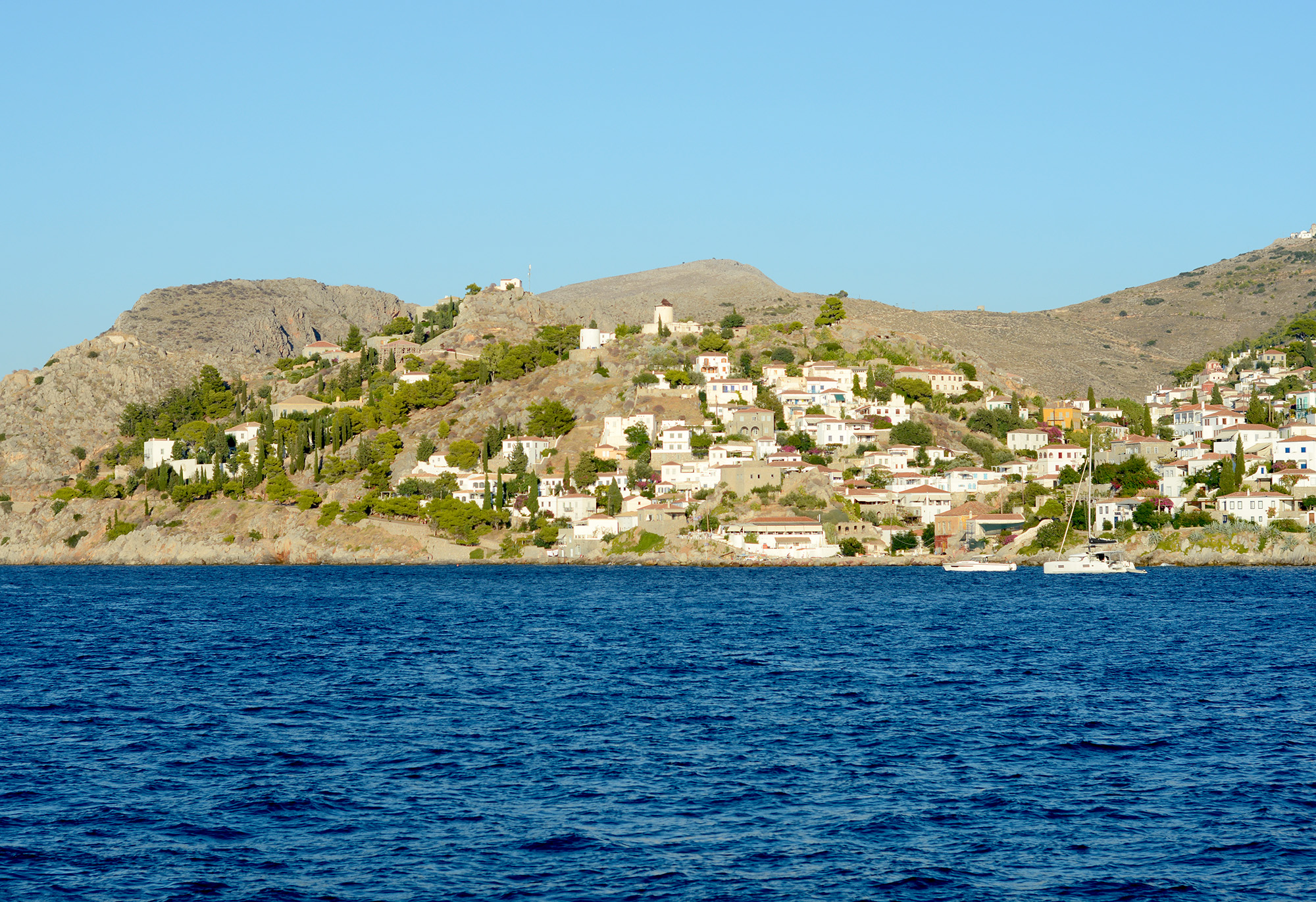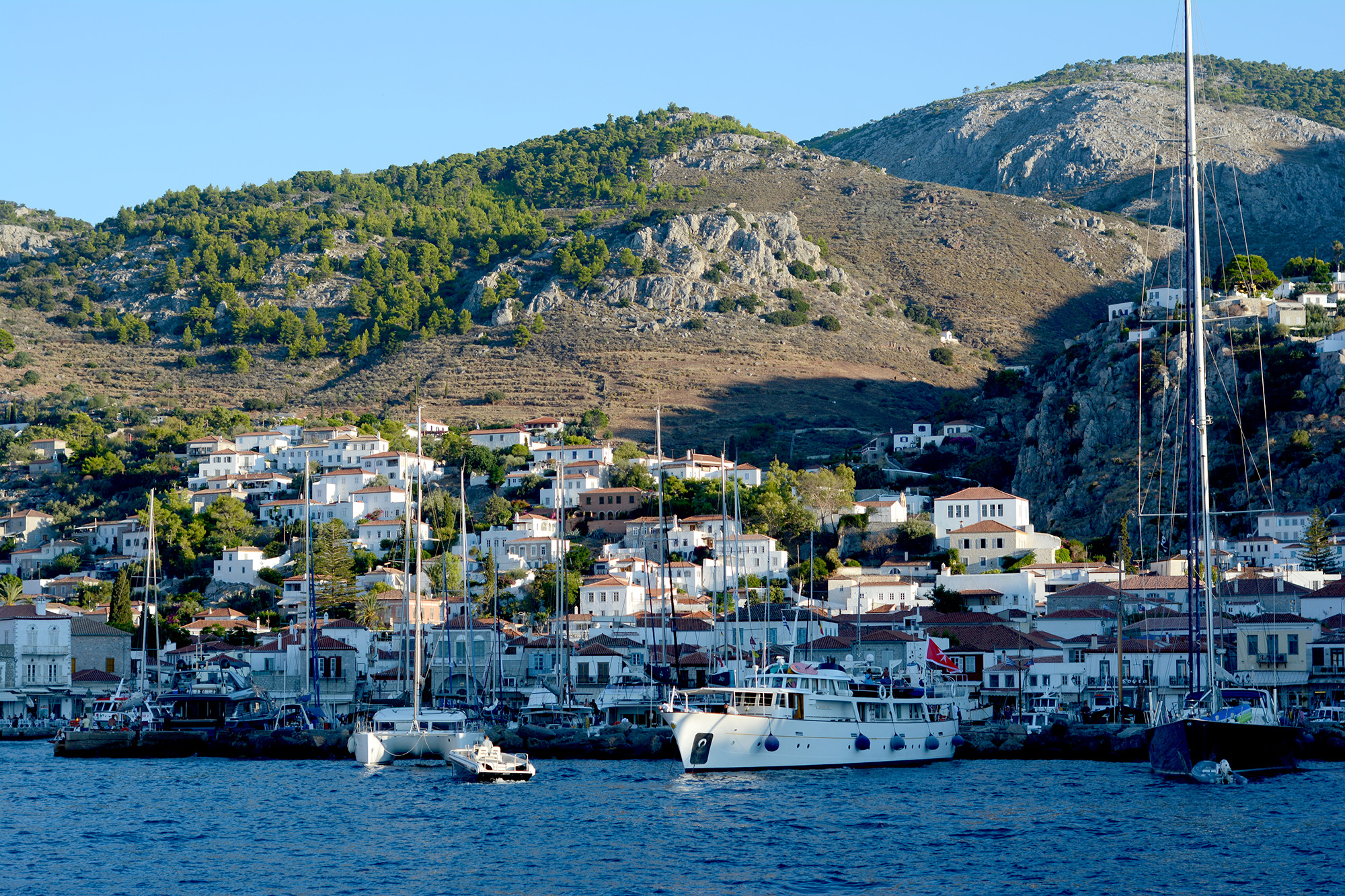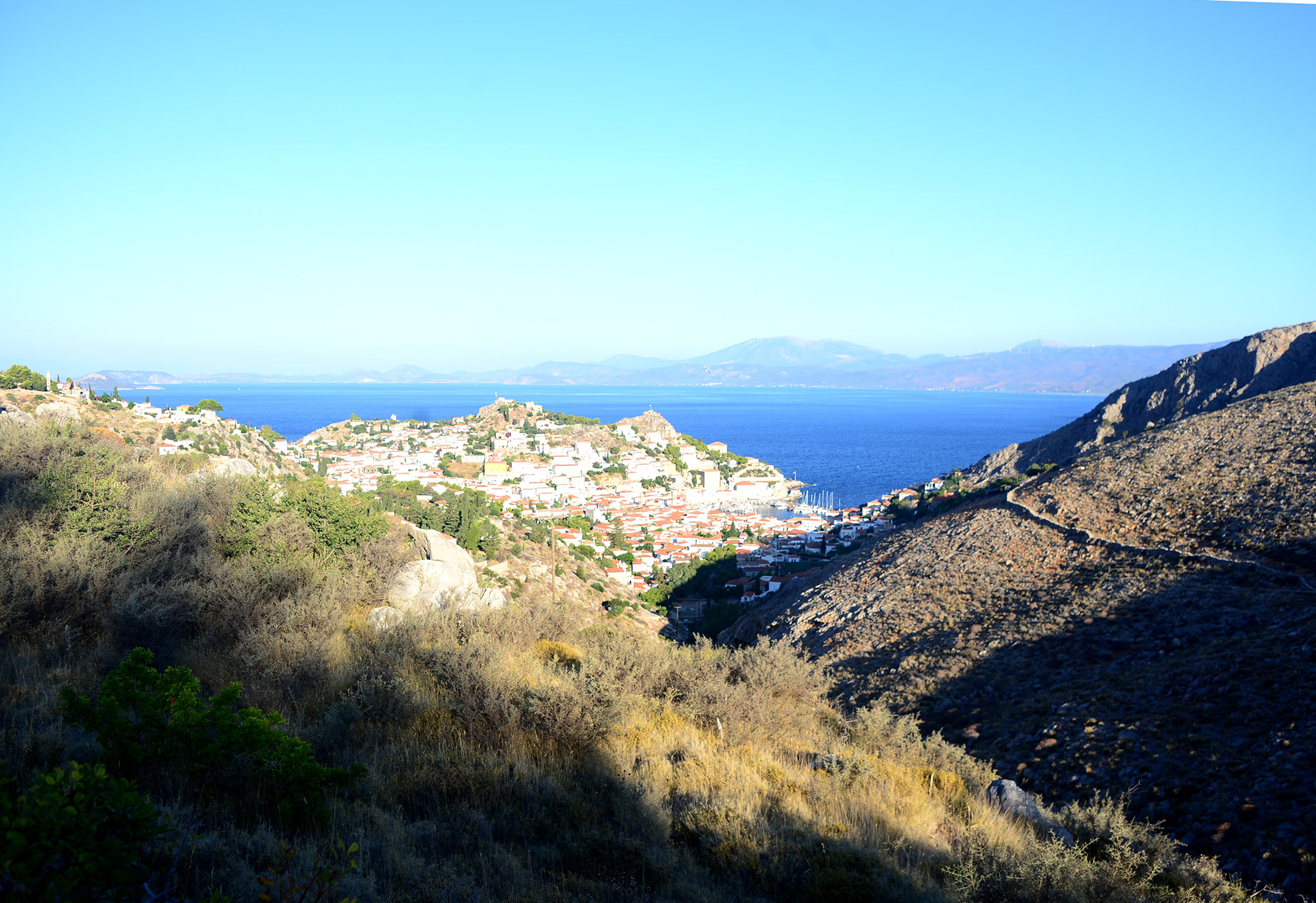 At seven in the morning in early September, the light over Hydra is more of an impression than reality, a fluid veil of burnt orange sneaking over the hills. The port is hidden from the rising sun, like a pearl inside its shell, by the barren, burnished cliffs that run across the island, like the arched back of a sleeping dragon. The day’s first boat departs from the port at seven, in the half dream of dawn I hear steps scuttling down the slippery stones, the familiar groan of a wheeled suitcase, a muffled conversation in quickfire Greek. Outside our window there is a small football field, each morning a lone runner makes poised rounds around it and then stretches in front of the goal. At seven the bells of the island’s countless churches respond to each other with frantic urgency, then fall silent as the tops of the houses in the port are finally turned crimson and ochre by the sunrise. Lying in bed I study the slow but steady progress of the nascent day and make plans.