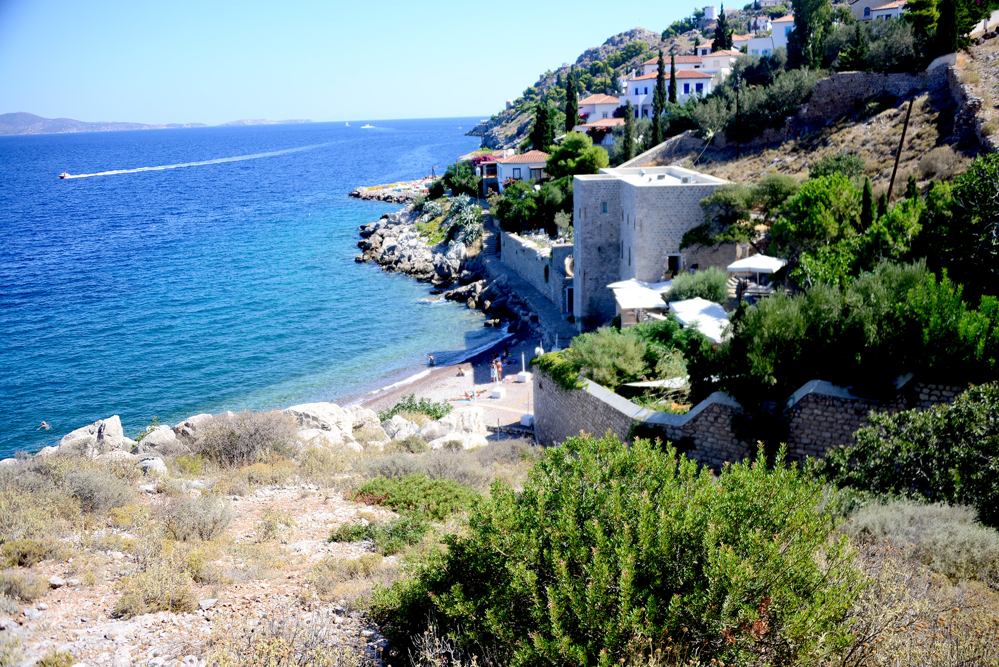 You can walk all the way to Plakes comfortably on foot, provided you are not a very old and tired British gentleman with sensitive skin, and if you turn westward from the port, you can also make it to Mandraki beach the same way. Mandraki beach comes in two installments: a lovely white and blue shack with a restaurant, a giant family of inquisitive cats, elderly locals chatting away and two waiters with a man on man interaction that could be anything from laddish to passionate. The other installment is advertised as Hydra’s only sandy beach and comes complete with overpriced sunbeds, thumping EDM music and annoying people on jet skis. Beyond it lies the wilderness, and what we discovered was Hydra’s garbage dump.