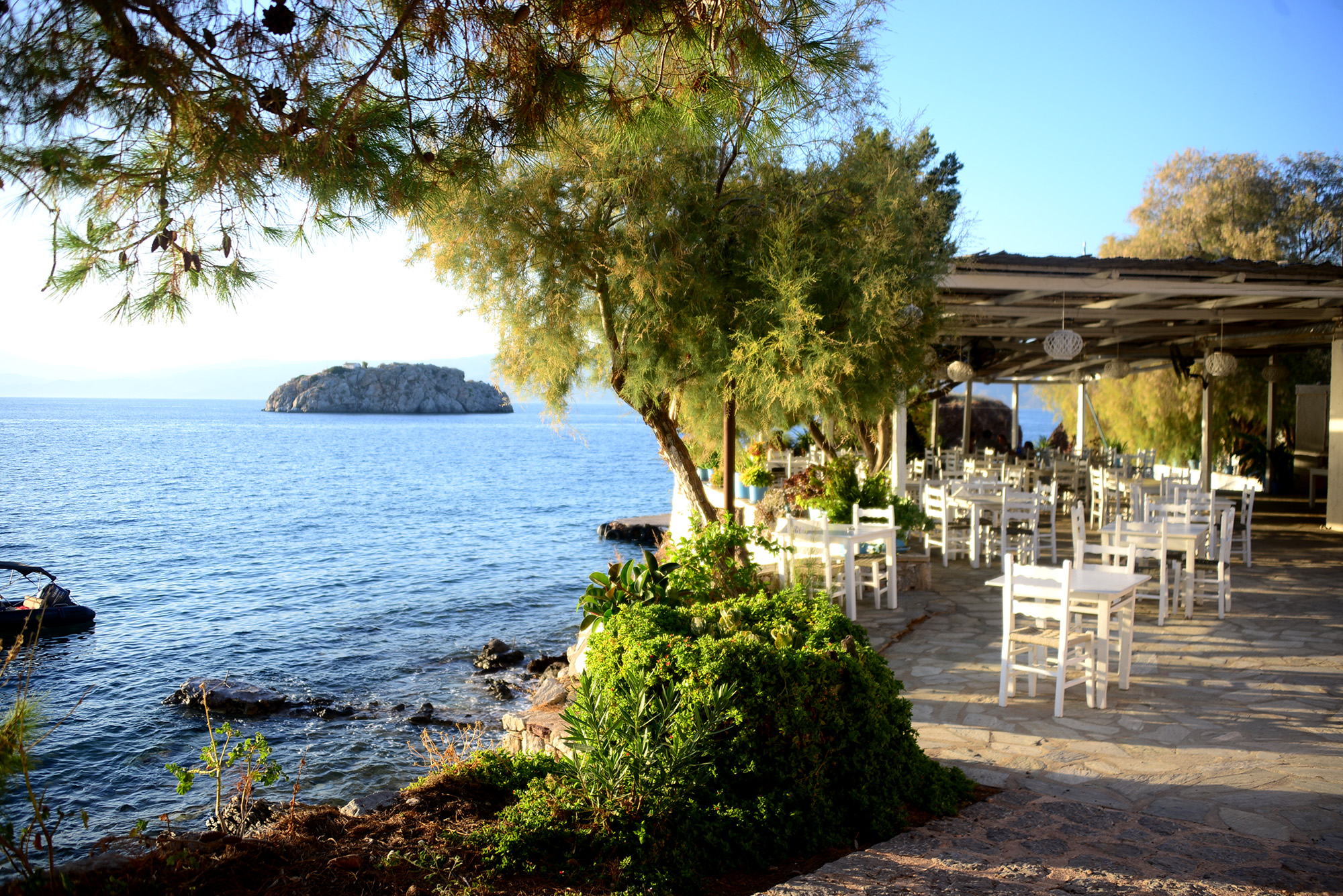 My fear of slipping on steep inclines is closely followed by my dislike of being in secluded places. We therefore dished out fifteen euros and went to Agios Nikolaos beach, the engine of our boat briefly catching fire in the process. At Agios Nikolaos we found a small bar with local beer, some sunbeds, scenic rocks behind us, a scenic gulf ahead and no network on our mobile phones. It felt a bit like a scene from Lost remixed with a corner of heaven. I was reading Patrick Leigh Fermor, who’d been to the island and apparently visited the home of painter Nikos Ghikas, which later burned down because Leonard Cohen placed a curse on it. To my right, and Italian man was reading a Camilleri I haven’t, and I thought, well, if we get stuck here, I’ll just ask him to swap books. We didn’t get stuck, our boat, engine in ruddy health, took us back to Hydra port. As the boat rode the waves I turned and looked behind me, at the trail of foam and glittering droplets we left as we passed, sunbaked faces smiling in the fading light. This was a dream I once had. And now it was real.