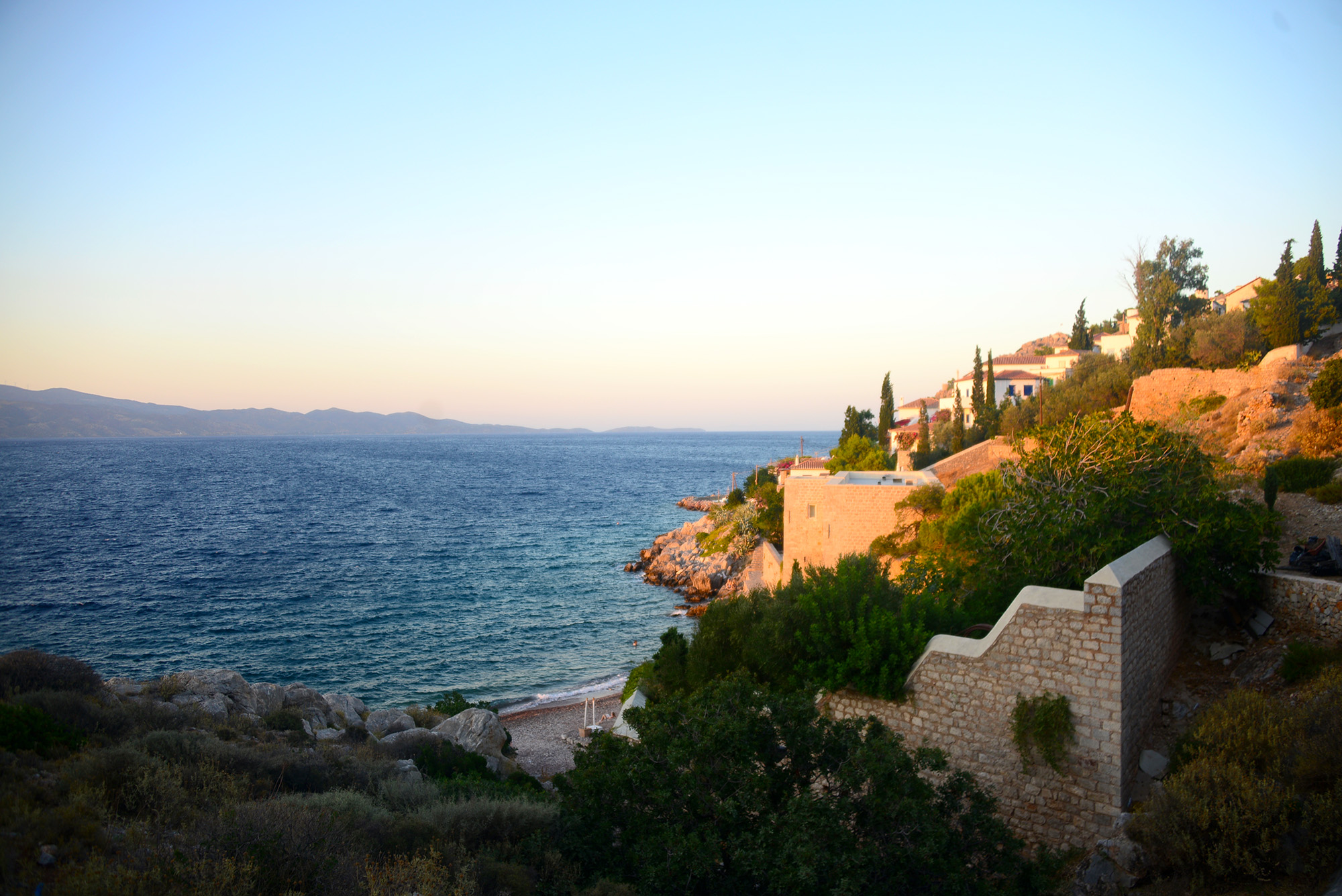 Walking across a narrow stone bridge you reach Vlychos beach, which grew on us like a familiar tune you dismiss at first but can’t stop humming later. Perhaps it was the friendly waiter, who immediately identified me as Romanian- coronavirus induced absence from my homeland has made me soppily sensitive to any sign of belonging. Perhaps it was the fact that both restaurants nearby- Enalion and Marina- proved to be excellent. Fresh salad, tzatziki, ruby red wine and a bit of tsipouro to help them along. Perhaps it was the lonely swimmer who left her belongings on the beach at sundown and just slithered out into the open sea as if in a dream. Or perhaps it was the Russians and the Brit. I strongly disliked them at first. Two women in their fifties (the Russians), lean muscles under skin tortured into parchment by the sun and botox. A much older man, white like fresh milk, their gauche sugar daddy who wondered why his feet were so sensitive. They were sensitive because he was ancient, the Russians were unhappy because they were supposed to go to the fancy Four Seasons beach, but they took the wrong boat and ended up on Vlychos. One of them was chugging tsipouro from a paper coffee cup, tried chatting to us, then dove into the waves like a low -cost mermaid. When she failed to return on time, her friend got frantic, searched the sea with desperate eyes. Lady Tsipouro’s eventual return elicited merriment and many signs of the cross. The old Brit had in the meantime gotten dressed and looked much like a recently discovered Egyptian mummy. As the last boat returned to Hydra port, they sailed into the sunset, and I almost missed them. Theirs was, in so many ways, a true Greek tragedy of how life is merciless to us all and never gives us what we really want.