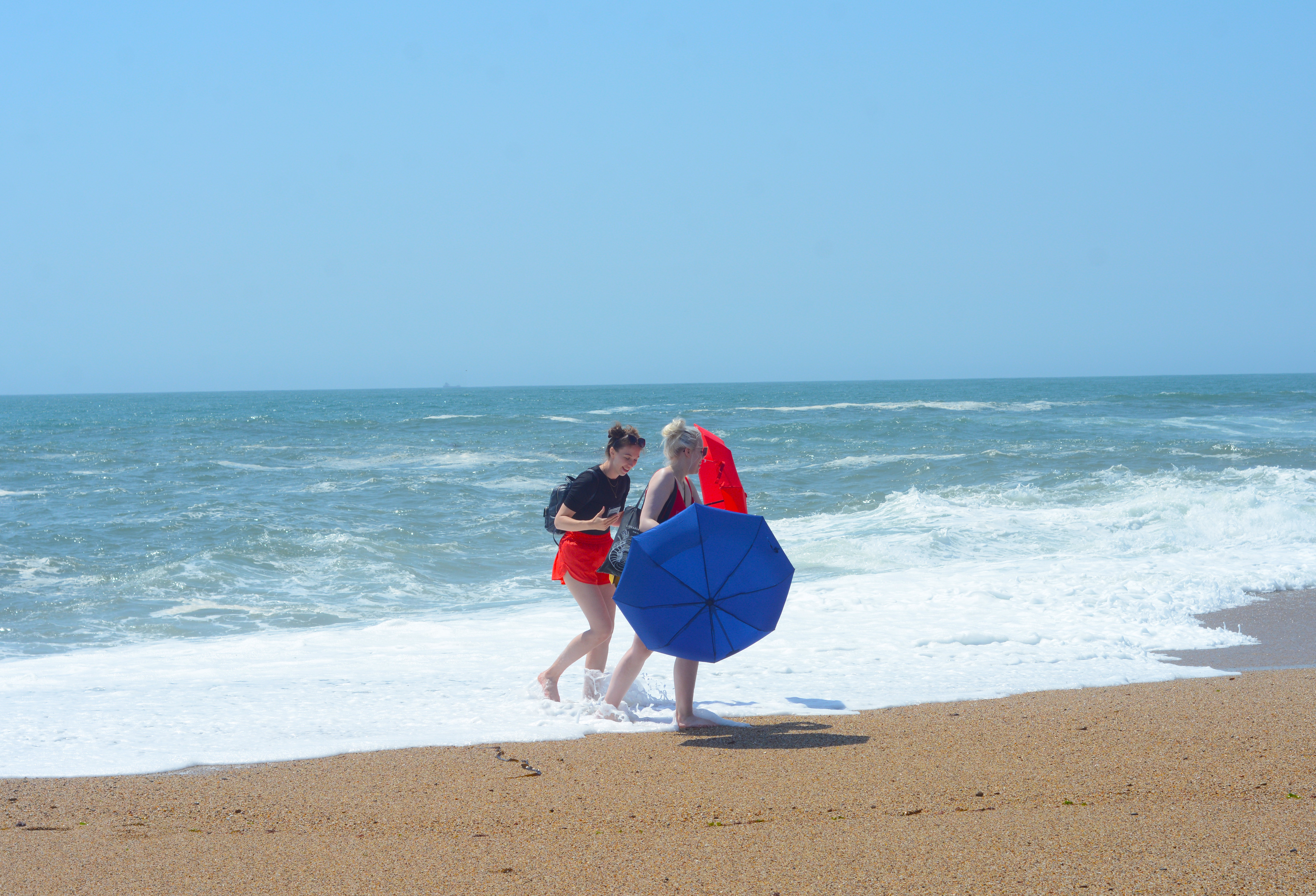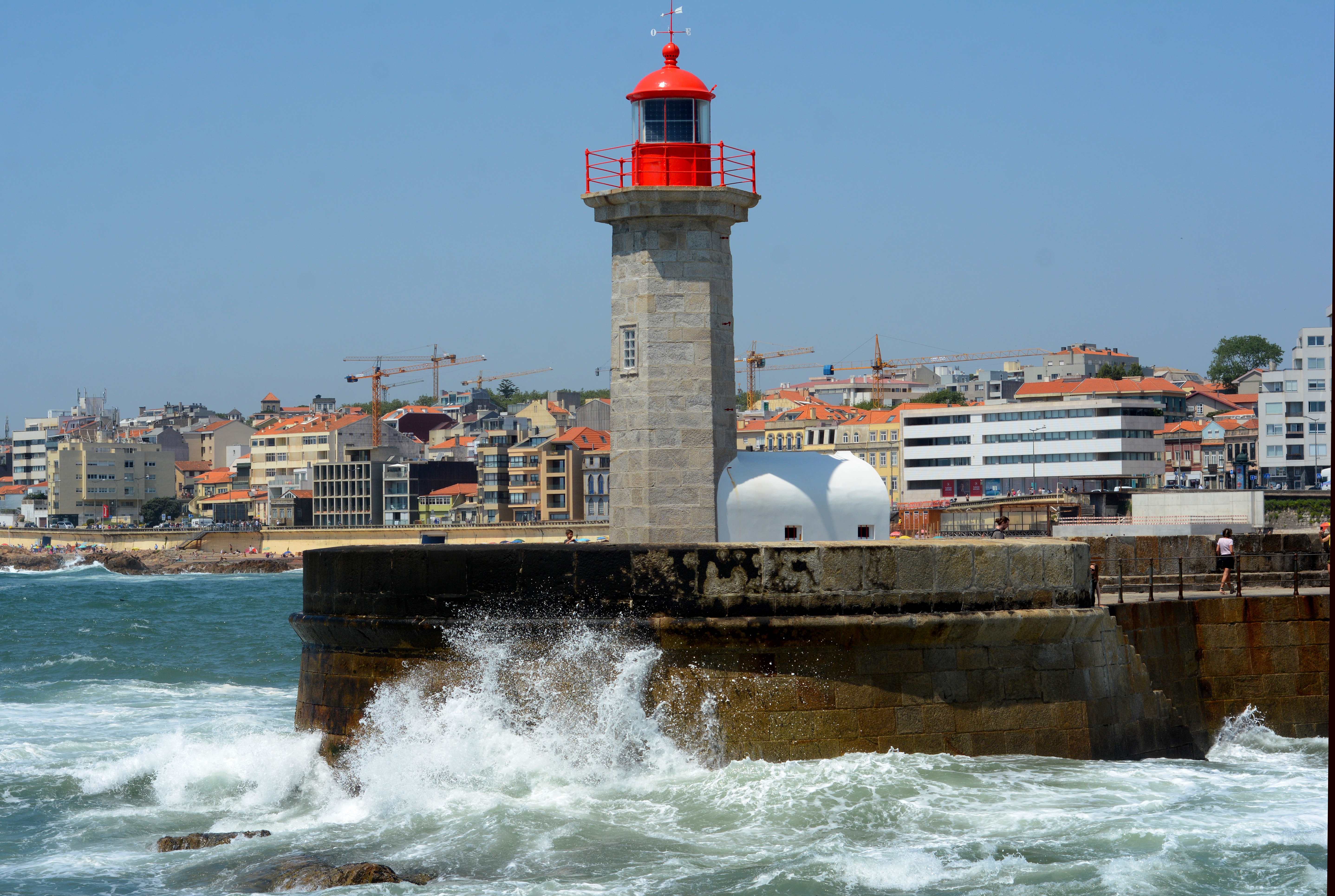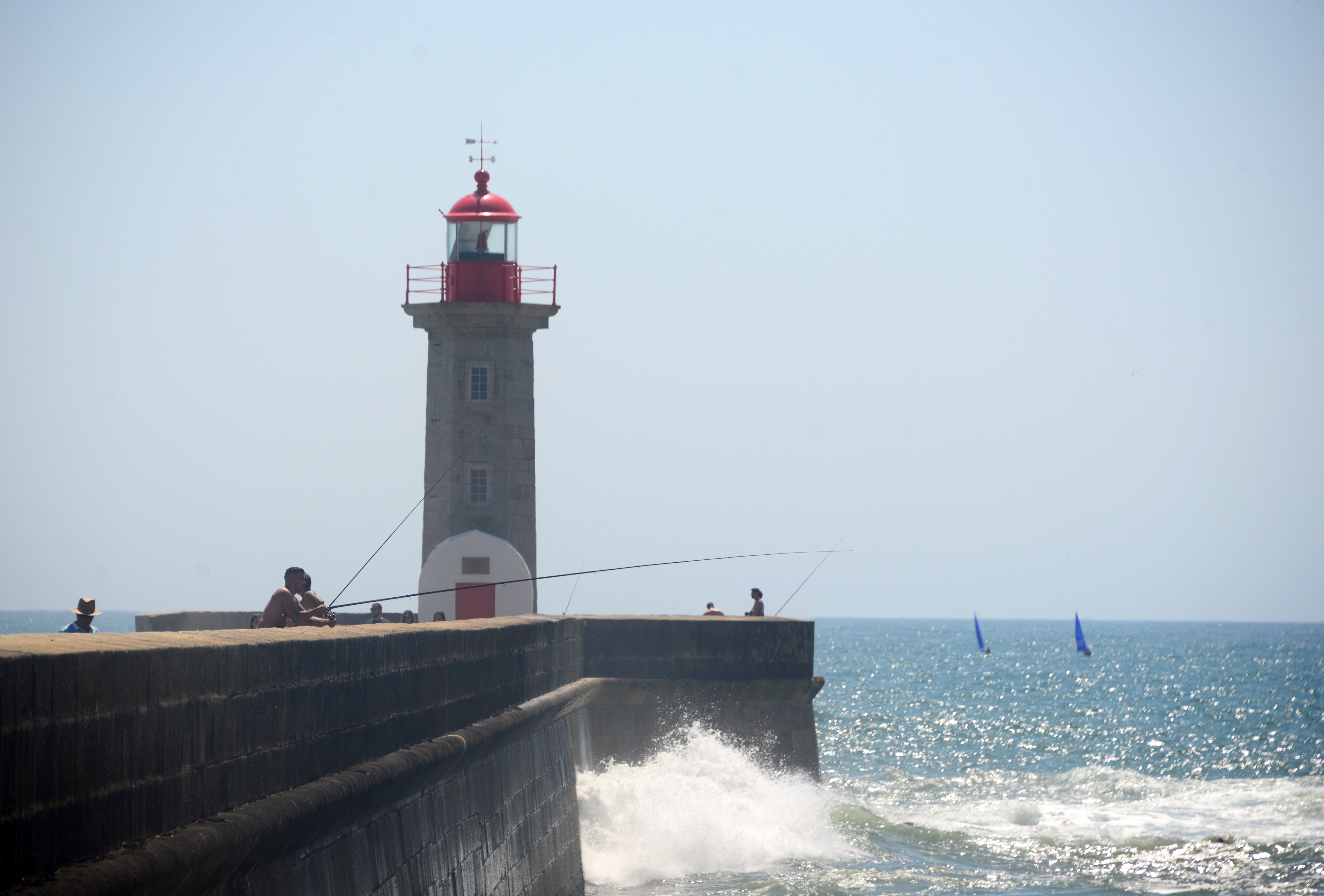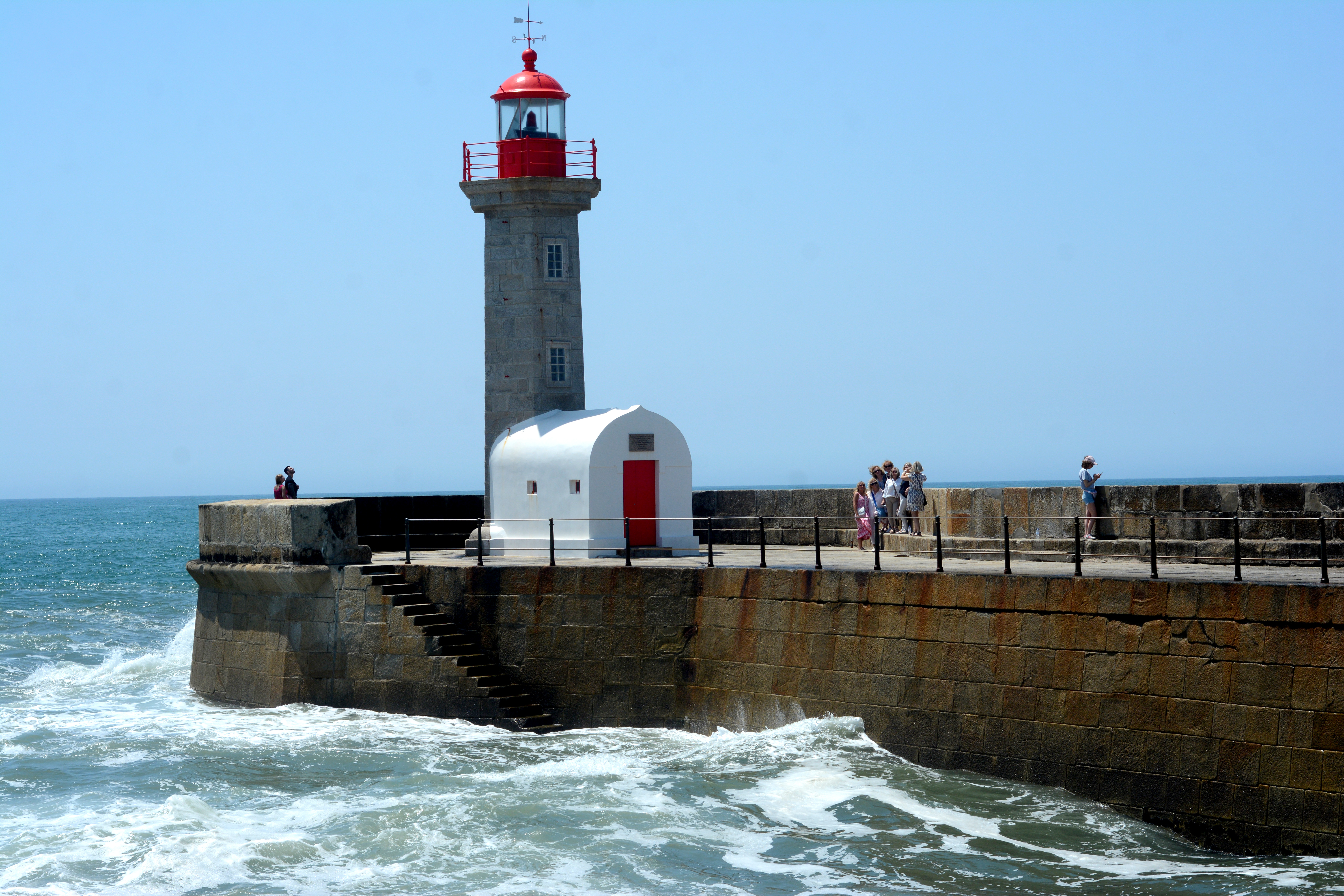 Back at the ocean, people were enjoying the sun, but generally keeping out of the water, for the sea was angry that day. Possibly not very angry, though, given footage of Portuguese wave action I’ve seen. The town of Nazaré, known for its giant waves loved by surfers, lies about two thirds of the way from Porto to Lisbon. This was business for a confident swimmer, then, who doesn’t mind the chill: average water temperatures around Porto are a very refreshing 17 degrees Celsius in June, the yearly peak being a measly 18 in August and September. As such, we focused our visit on inspecting the two walkways which lead to the lighthouses guarding the entrance to the river on the northern shore. There is a matching lighthouse on the south shore, and behind it, another beach, Cabedelo do Douro, recommended by the locals as possibly less wavy than the ones we visited.