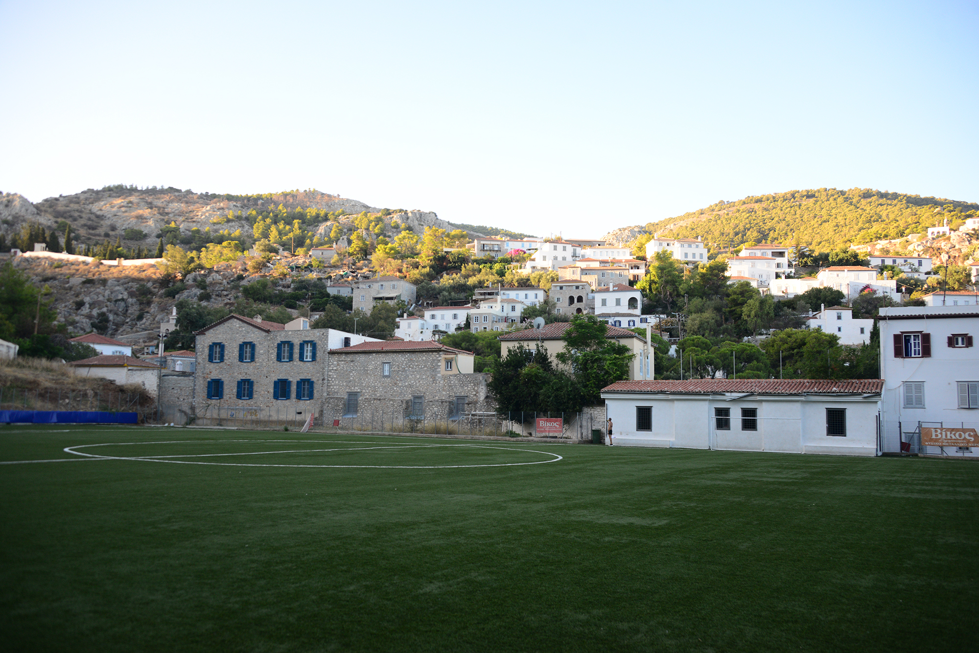 Nor are you the same person. Much improved by reading presocratic philosophers, I am now a person who runs in the morning, even when on vacation. There are several options for the dedicated runner, on Hydra, and it seems that very many people read presocratic philosophers and/or follow Tik Tok influencers. If you run enough, especially with little water and later in the day when it’s blindingly sunny, you might even start pondering how philosophers functioned quite like influencers back in the day, and so then today’s Tik Tok influencers are…I rest the thought here. Nevertheless, many people run on the two seaside roads leading towards Vlychos and Mandraki, and some hardcore fitness freaks run on the grueling trails leading up towards the monasteries and across the spine of the island. Me, I run circles on the pretty little astroturf pitch, and it’s not (just) me calling it pretty, it has been featured in several series on the most beautiful pitches in the world. There are some dedicated, and evidently fitter, runners out there every morning. A little nod, and then I’m off on a slow jog, chuckling to the Football Weekly, and contemplating the inevitable progress of time and the passing of the seasons: every morning, the sunlight breaks from over the hills at a later time. When it finally lands on the pitch, the plastic grass gleams golden, and the heat becomes unbearable. Time to retreat- for me at least, the locals seem immune to these challenges and run on. Allow me one last football themed side quest: shirt mania has reached the island, your classic Brazils and Argentinas, styled as edgy resort wear, punctuated with the occasional local gentleman sitting on the terrace of a port side café, sipping his freddo cappuccino, inspecting the disembarking of wares from the Georgia (the boat, not the country), and casually wearing an Olympiakos Piraeus shirt, UEFA Conference League Winners patch proudly displayed on the shoulder.