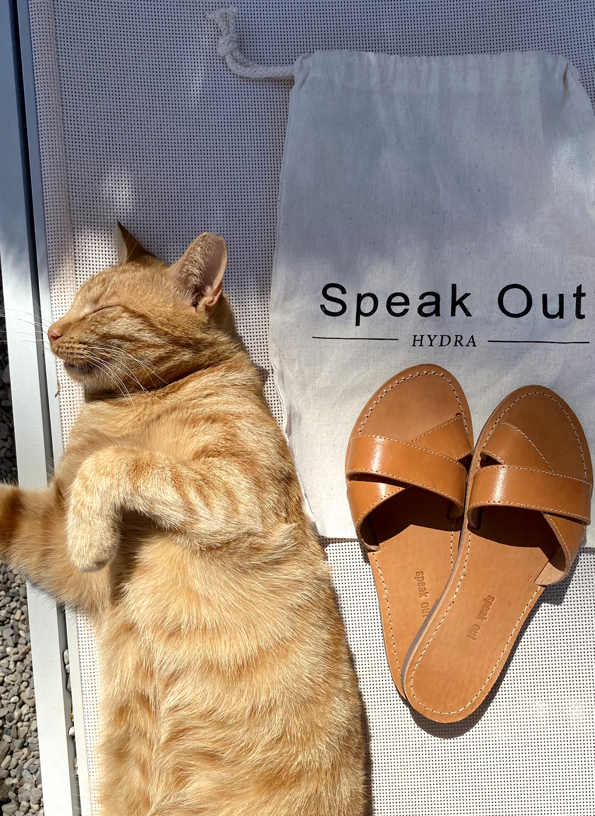 There have been big changes on Mandraki beach as well- not the resort, or the ‘rich beach’, as a Romanian catamaran adventurer called it, but the ‘plain’ little beach right after the turn of the road. The restaurant, now called Lefteraki’s, has a new look, but thankfully they kept the same portokalopita, which comes with sumptuous ice cream and is still the best on the island. The major change is the improvement of the amenities- new, more comfortable sun beds, a changing cabin, a beach bar. We were delighted by this development but were soon to learn that some of the locals were less enamoured with the project. What used to be a less frequented beach with lower prices has now become a busy and hip hangout. Generally speaking, in the few years since we’ve started coming regularly, Hydra has steadily grown in popularity- a bit of a Moo Deng of the Greek islands, if you will. While the algorithm obviously knows I like to see as much of Hydra as possible on social media, I have noticed images popping up on the profiles of random people I know from different walks of life. With so many other islands now overrun by tourist hordes, Hydra has become tantalisingly attractive, particularly for a certain crowd of quirky, slightly artistically inclined people. I am not passing judgement here, as I realise I am very much a part of this crowd, it’s a simple observation, with perhaps a little worry of what is to come in terms of the island remaining livable, for locals and visitors alike. In a decidedly positive note, the ginger kitten we’d nicknamed The Menace of Mandraki last year has now grown into a wise overlord of the beach. Aggression has been replaced by insinuation and calmly looking gorgeous, adorable and hungry at the same time. Rafa, as he is know, is so good at his job that he managed to convince a group of French people to feed him caviar. He’d also make an excellent Vogue cover, colour coordinated with my newest precious loot from my favourite store on the island, Speak Out. I’ve raved about Christina’s sandals already, and now I can confirm that the slippers are equally beautiful and comfortable. There are many more lovingly curated wonders in her store, an absolute must visit place if you’re on Hydra. Another must, if you come in early autumn, is the Hydra book club, open daily in the building of the Historical Archives Museum. I call this, in the most positive way possible, a highly dangerous place. Just as with Speak Out, the key is that this is not simply a store, be it of objects, or books, but somebody’s careful selection of things they like, and would want to share with others. Long and the short of it, I bought books again. As somebody who flies with Ryanair, I simply like to play with fire when it comes to the luggage allowance. It makes me feel more alive.