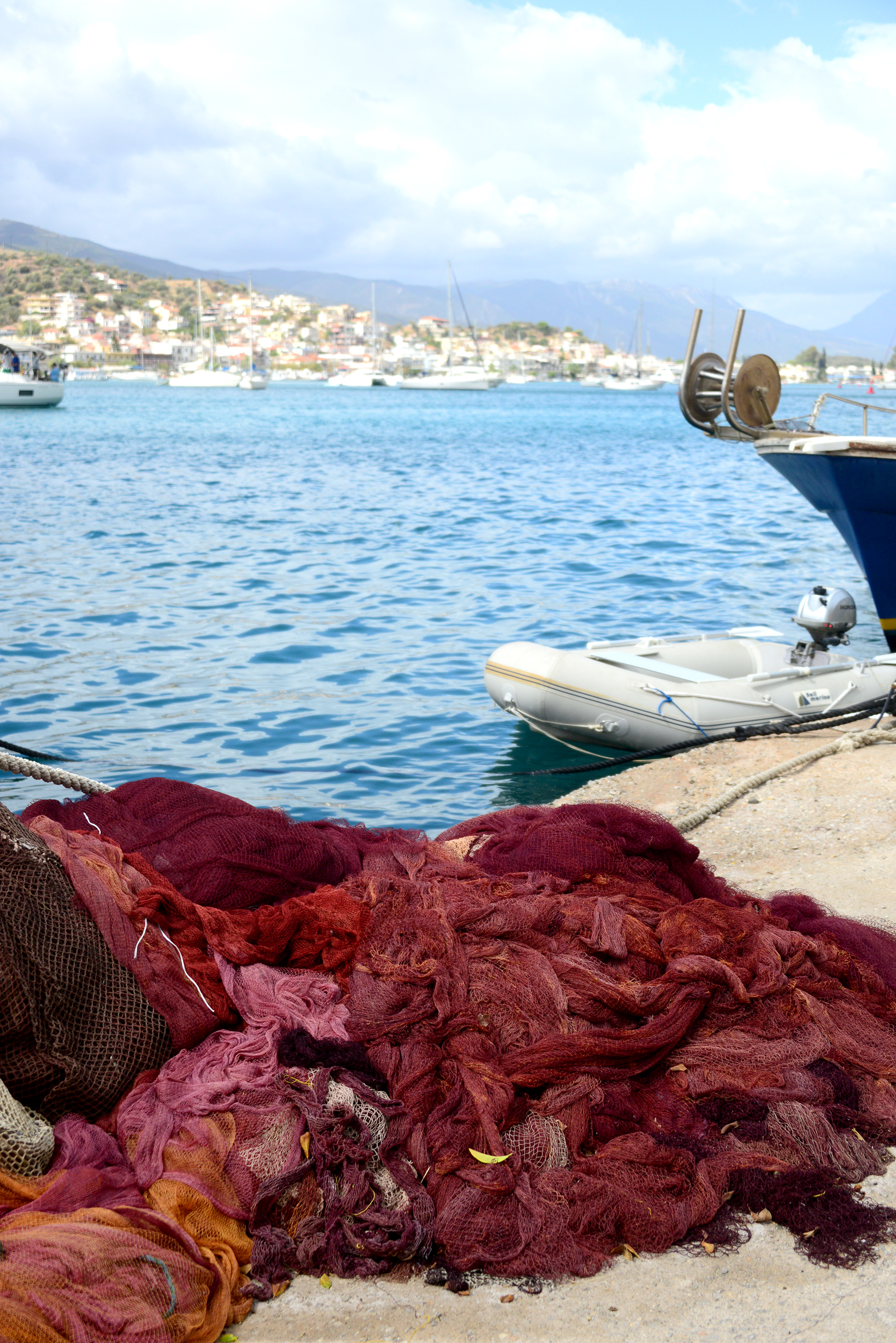 Instead, I went for a walk along the pier, under what had now turned into a positively ominous, black sky. I concluded, based on ample evidence, that a lot of boating, of the leisure and fishing sort, is perpetrated on Poros. Then suddenly the island of Sphaeria ended, with the church of Timios Stavros perched at the far end, and a few brave swimmers dipping in the sea before the imminent arrival of rain. Most terraces had not opened for the day, and looked like they might opt out of it altogether if the gods insisted on inclement weather. I therefore settled in Taverna Nautis (The Sailor), where two Swedish men were already about three beers deep, and wondering if the sky would clear by 3 PM, when they have a boat trip planned. The waiter, philosophically, concluded that the sky might clear, but also, it might not. The Oracle of Delphi could not have done a better job at delivering ambiguous prophecies. And then the downpour arrived, washing us off the terrace. The Swedes retreated to their boat, moored nearby, whereas I joined the staff inside. This was an unexpectedly lovely arrangement, and a couple of glasses of retsina made it even more lovely, until, in a sudden move, I sent one of my earrings flying across the room, and it seemed to have been swallowed by a black hole. After a lengthy search, I was ready to give up, but the waiter, a good man, and thorough, did not. The earring was duly located under a slip of paper someone had forgotten under one of the tables. I felt that this was a good omen, and, again, a testament to how Greeks will make sure to help you out, whether you are in a small or a large calamity.