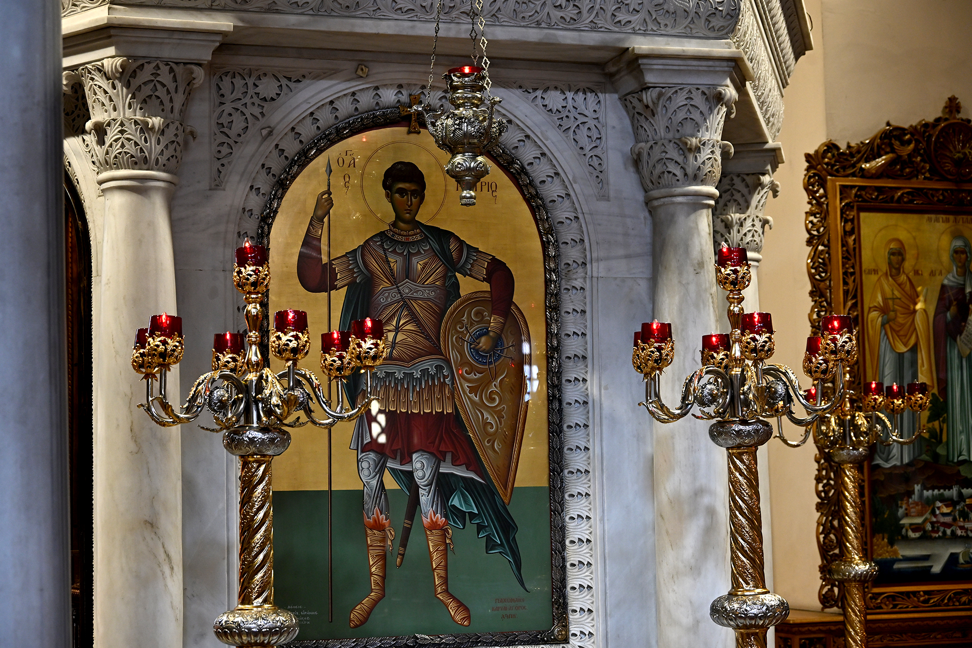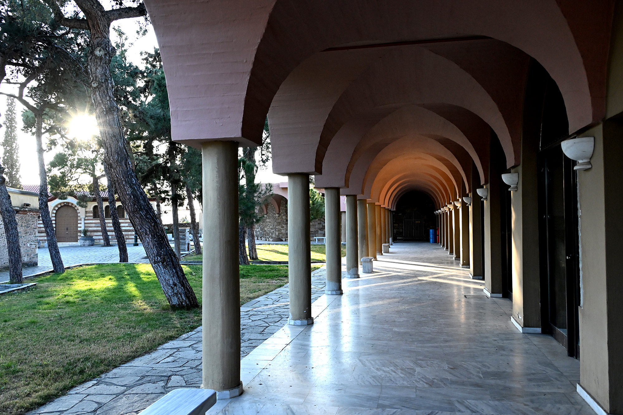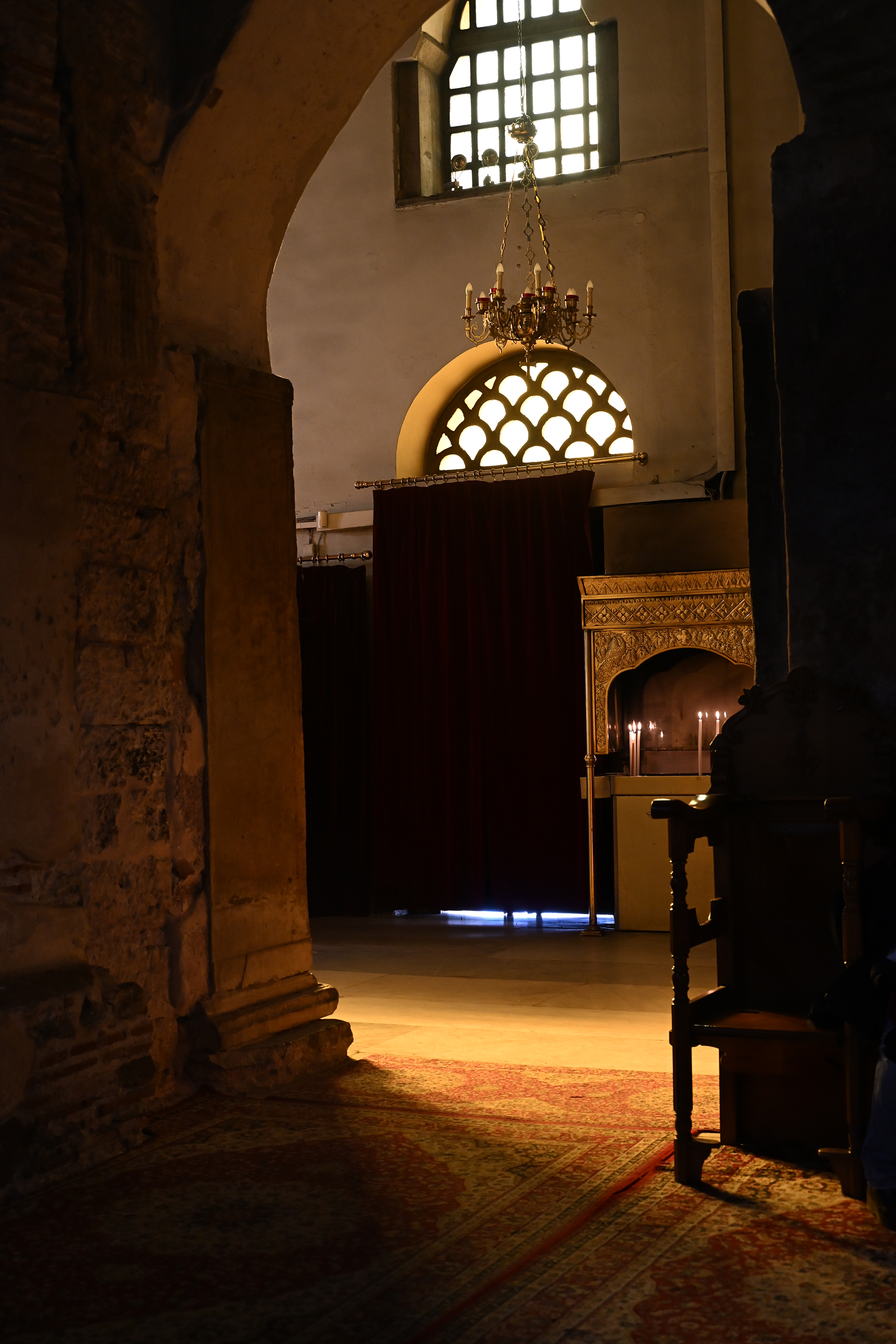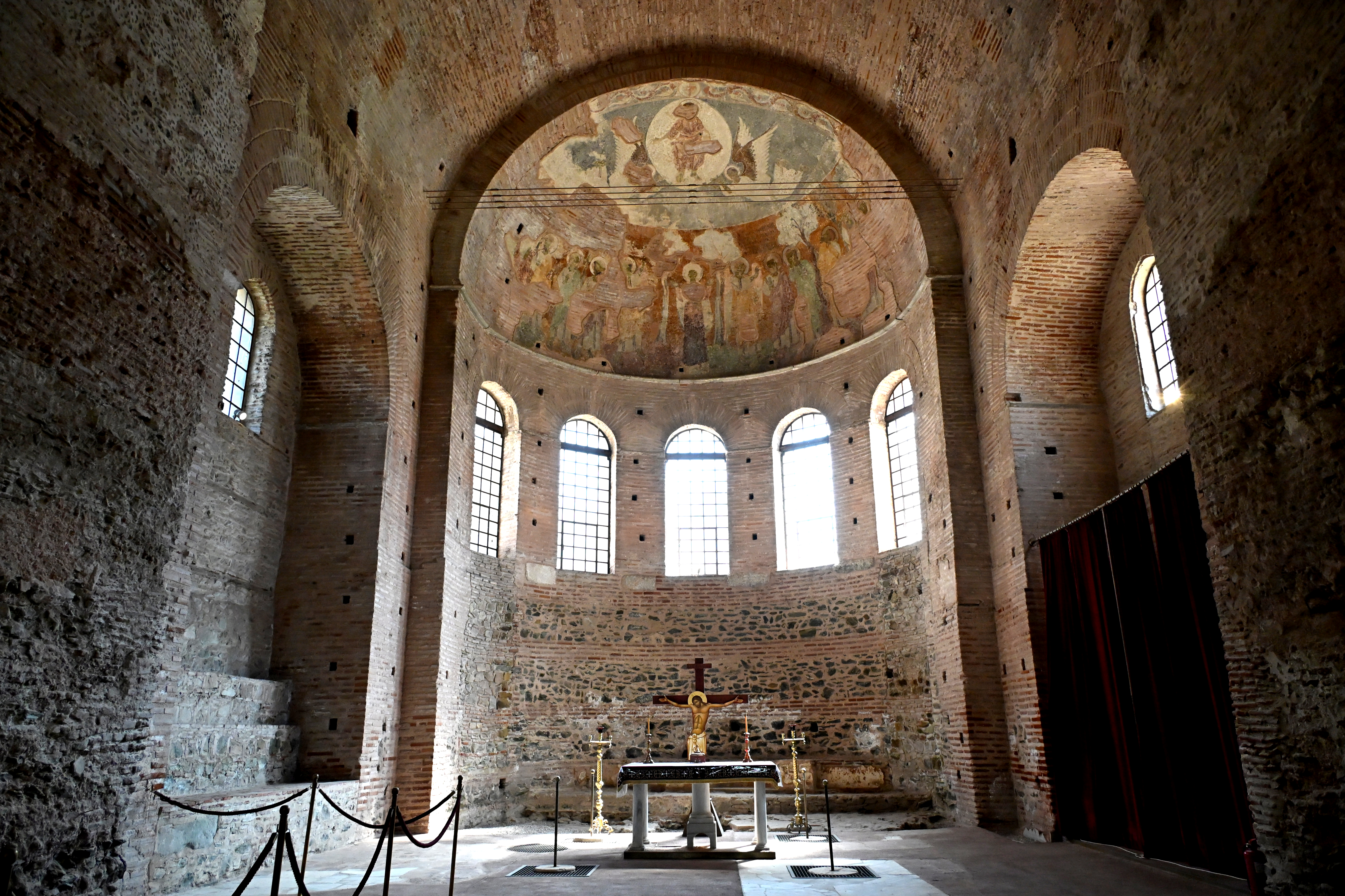 Rather disappointingly, we again missed out on a visit to the Osios David church and its famed mosaic as the 9 to 15:30 opening hours proved unexpectedly challenging to our schedule. We did visit the Church of Saint Demetrios, dedicated to the city’s patron saint. His relics are to be found in the church, though, as with the remains of Saint Nicholas in Bari, the story is more complicated than it seems. After his death in around 306 CE, the relics went missing, and showed up in Thessaloniki about a century later, their veracity remaining contested until they helpfully started emitting a strong scented myrrh. Greek tradition worships him as the patron saint of agriculture, peasants and shepherds, a job he likely inherited from the similarly named goddess Demeter. The church in its current form dates back to the 7th century, when the initial shrine, ravaged by fires, was reconstructed, and is home to six mosaic panels from the early 8th century, before the start of Byzantine iconoclasm. It served as a mosque during Ottoman rule, and was extensively renovated after being damaged in the great fire of 1917. During the renovation works, a Roman well was discovered, which some believe may have been the place where Demetrios’s body was dropped after execution.